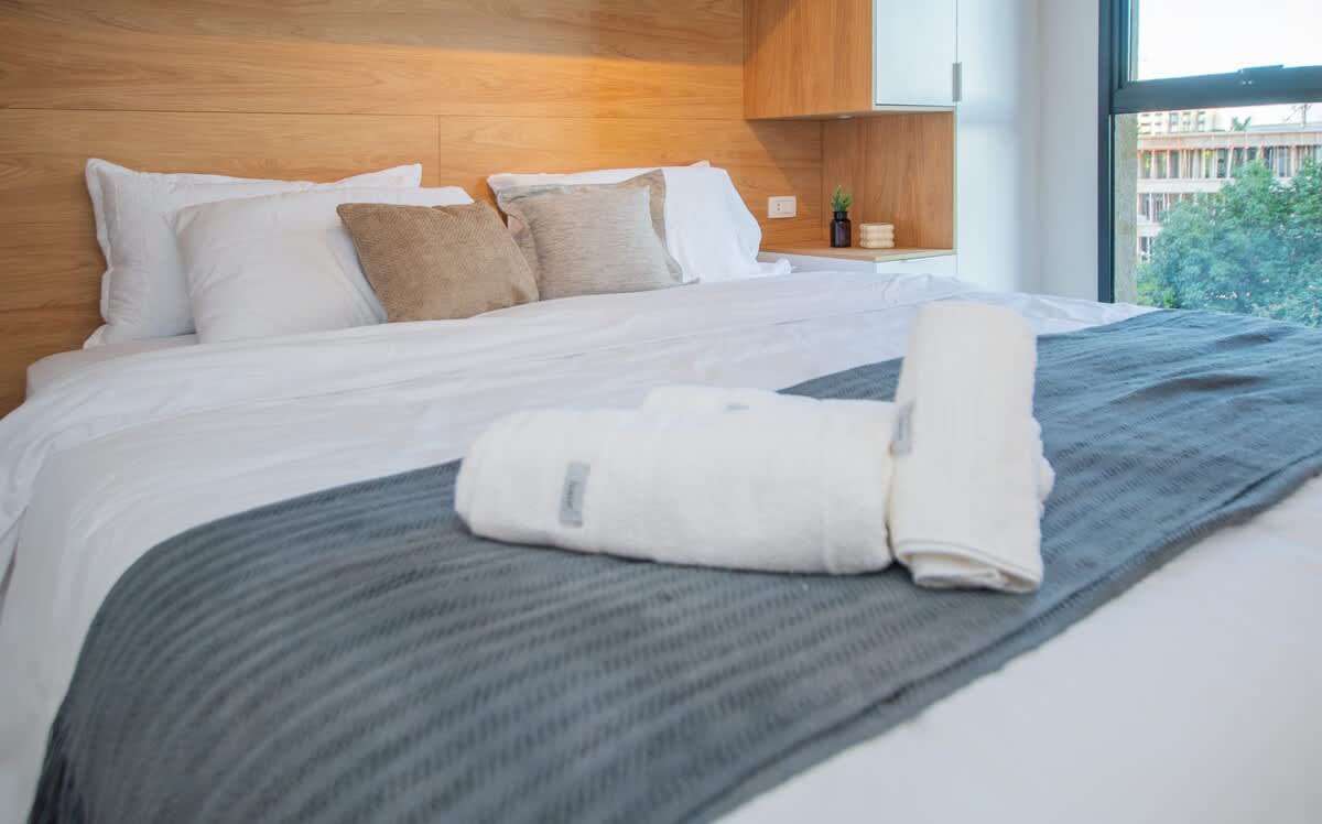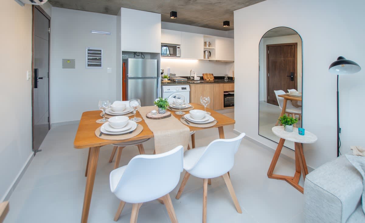 1-bedroom Apartment in a new building designed for short-term stays. Located in a prime area of Asunción, just 250m from Shopping del Sol and 600m Paseo La Galería. Features include a rooftop pool, gym, movie room, coworking space, and BBQ zones. Includes balcony and 24/7 front desk.