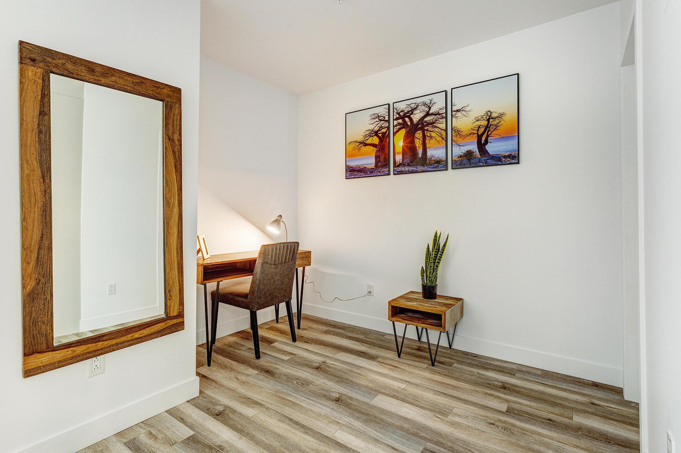 Inside, the apartment features a contemporary layout. The kitchen includes granite countertops, a slab backsplash. Porcelain tile flooring in the bathroom and luxury vinyl tile flooring throughout the living areas elevate the overall finish.