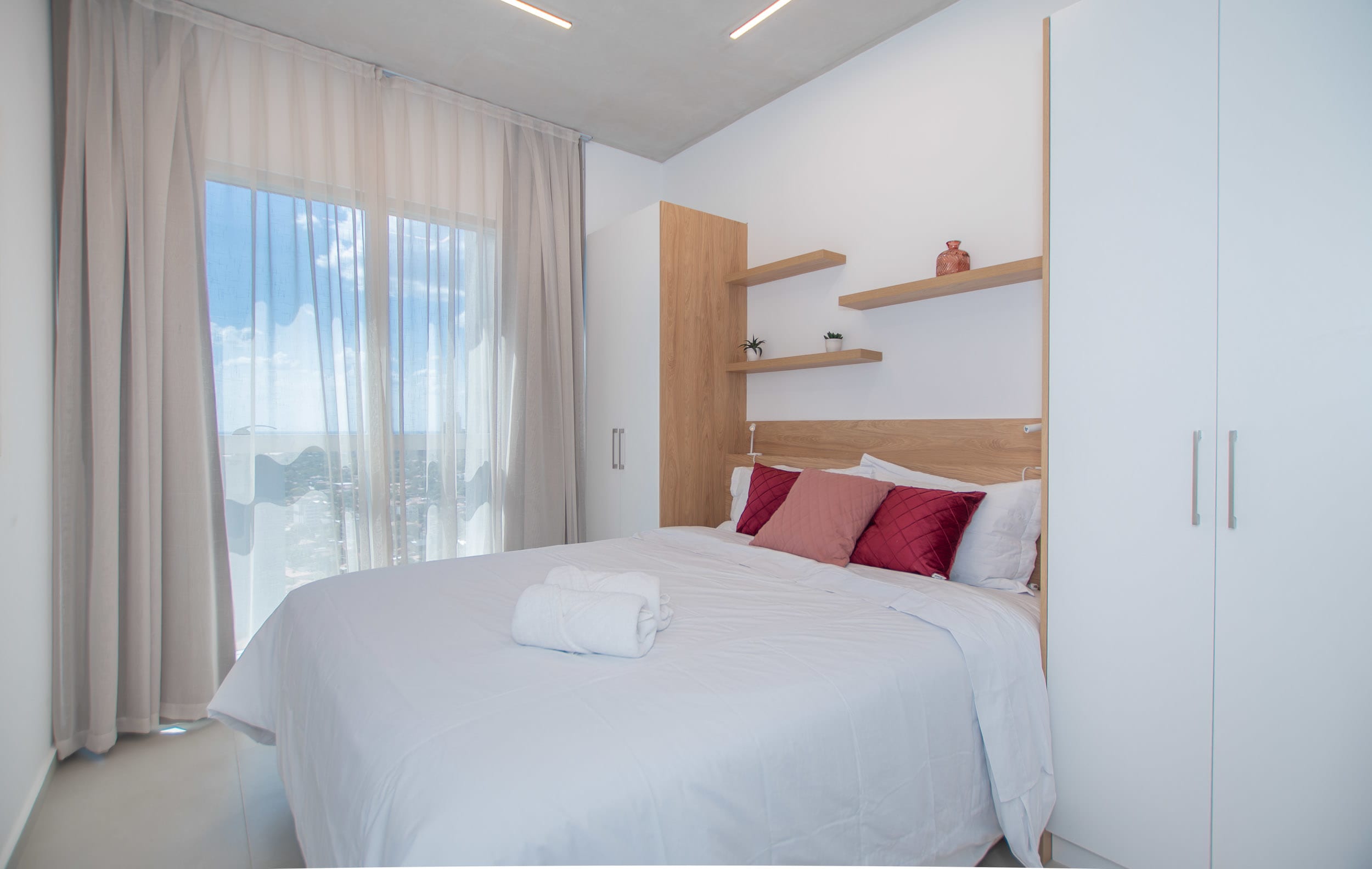 Guests enjoy access to premium building amenities, including a swimming pool, fitness center, 24/7 security, and welcoming common areas. Conveniently located along a main avenue, the building provides easy access to business districts, shopping centers, restaurants, and cafés.