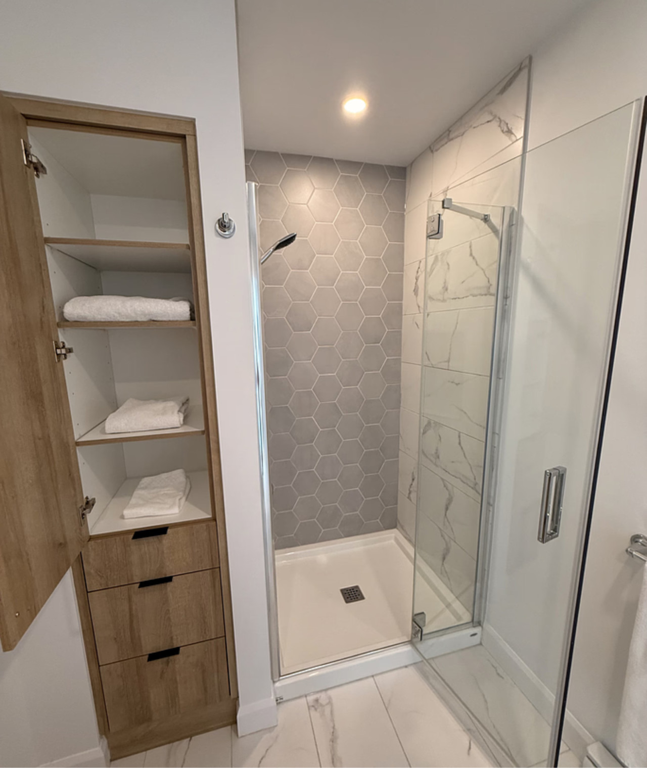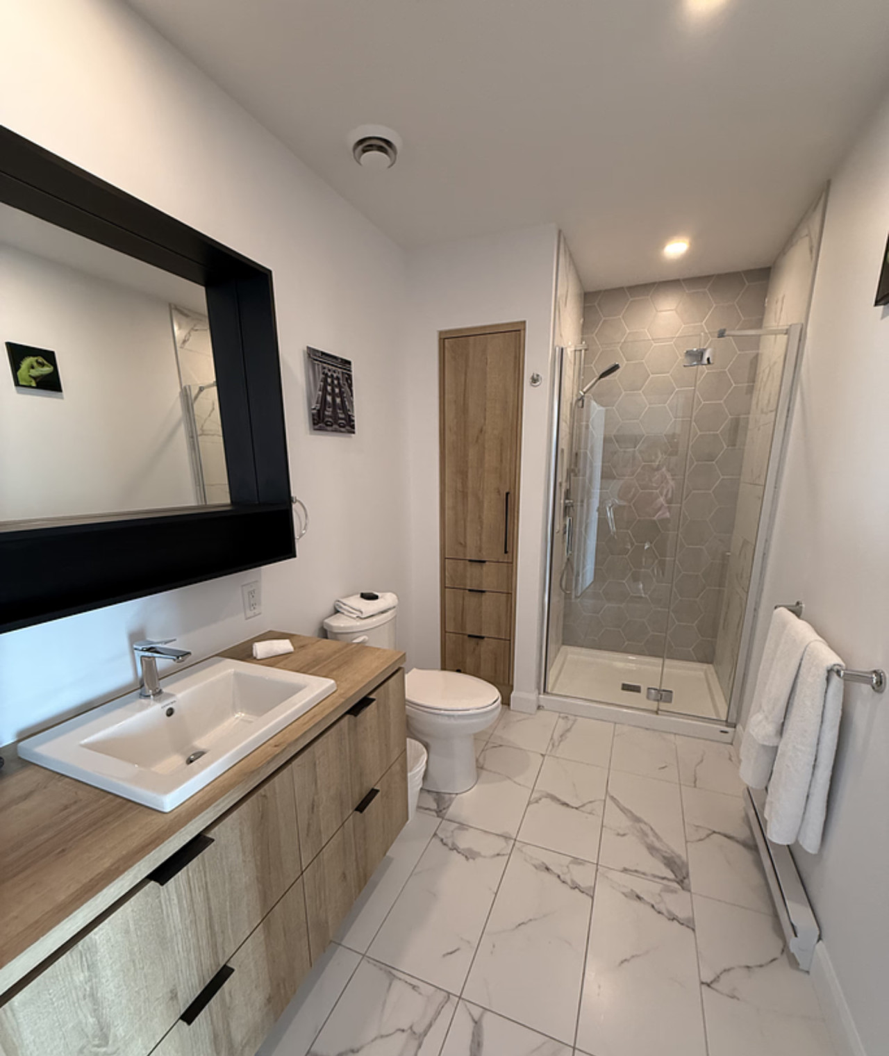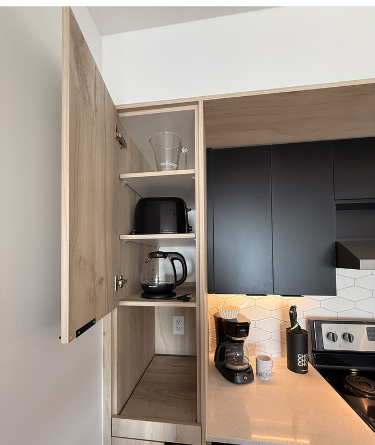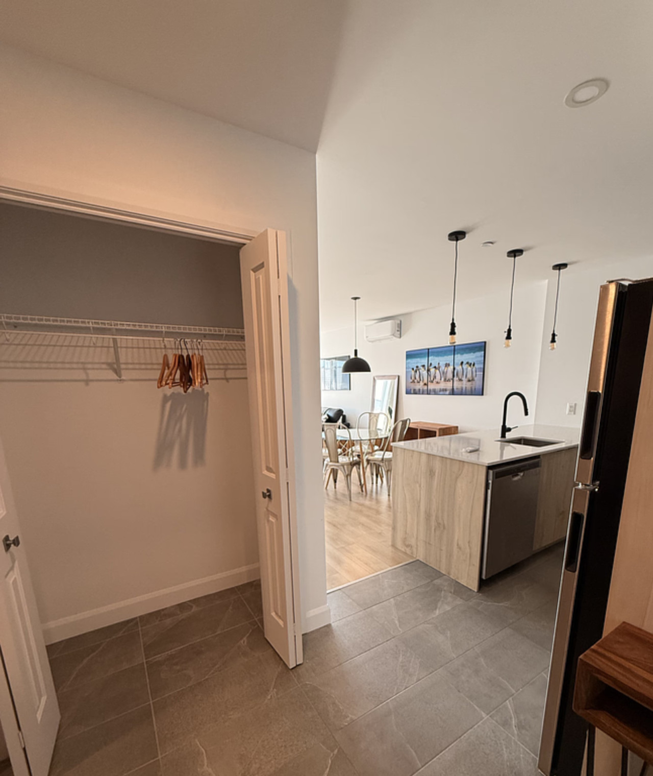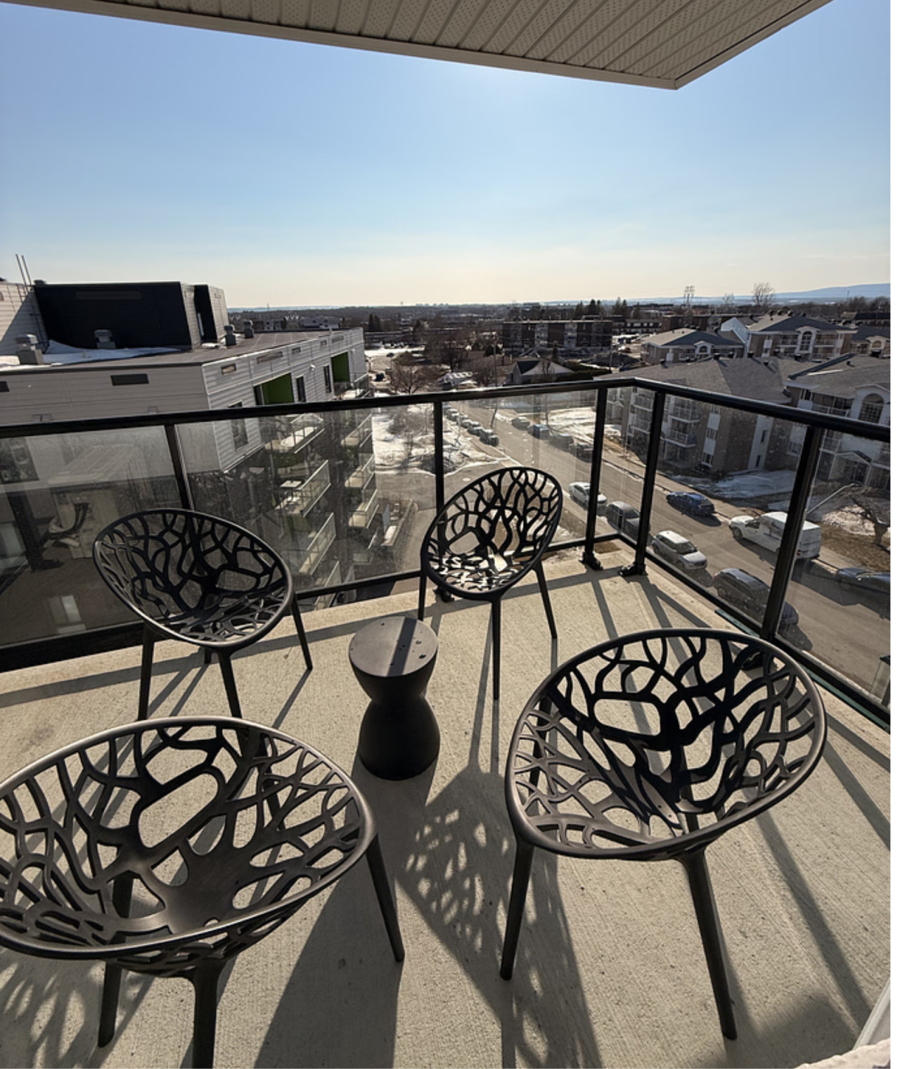 Inside, this extended stay 1 bedroom furnished apartment in Quebec City features a contemporary open-concept layout designed for both functionality and comfort. The fully equipped kitchen flows seamlessly into the living and dining area, while large windows bring in natural light. The private balcony extends your living space outdoors, and the in-suite laundry room adds everyday convenience.