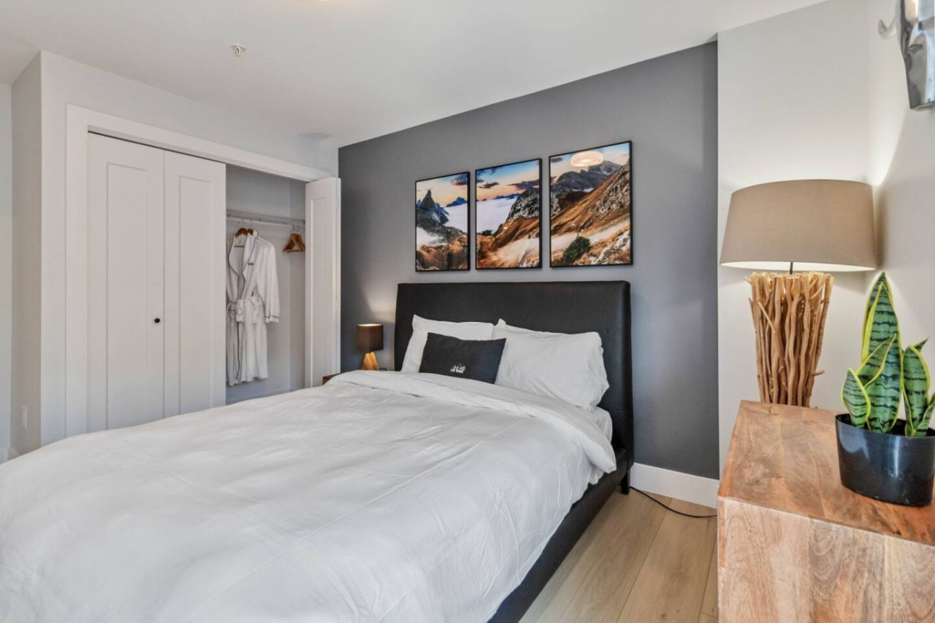 – Primary bedroom features a queen-size bed, an ensuite bathroom, and storage space