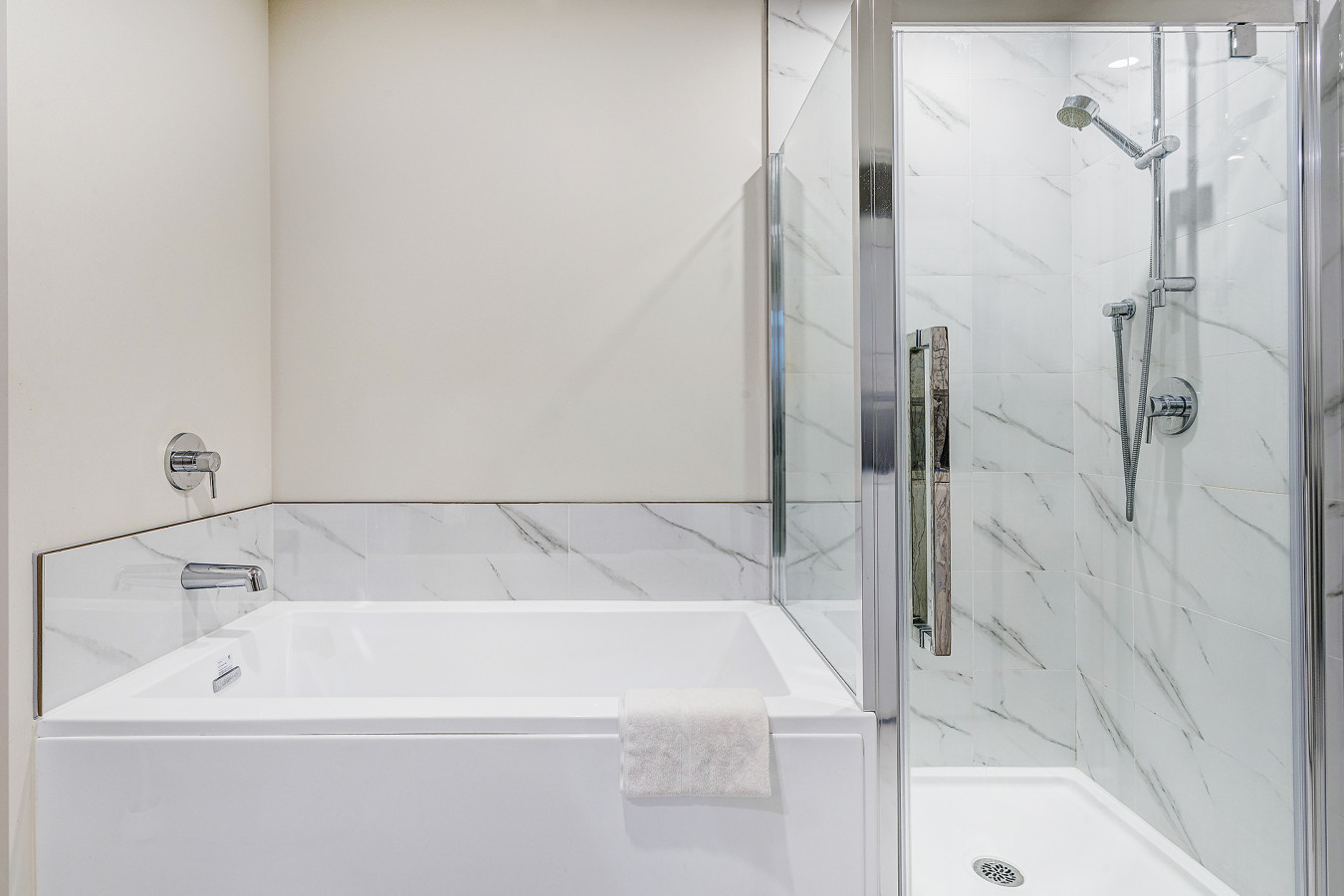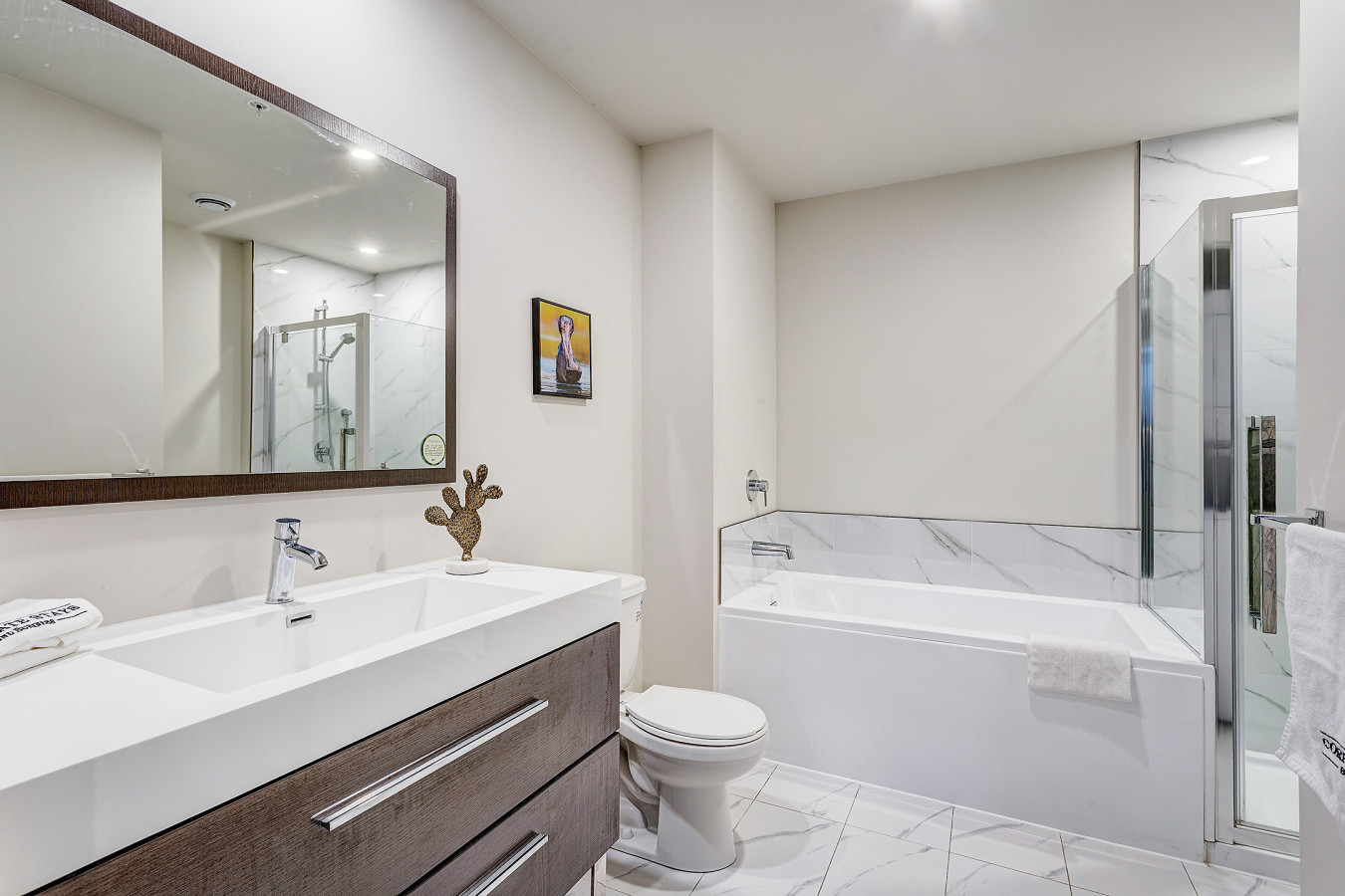 Rest comfortably in a tranquil bedroom featuring a queen-size bed and neighborhood views. The full bathroom includes high-end fixtures for a refreshing and comfortable experience.