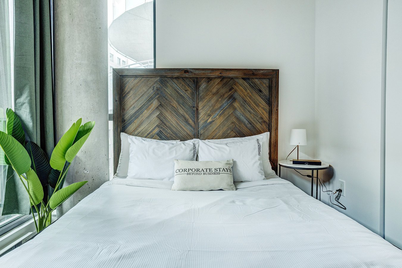 Relax in a bright and inviting living space with picturesque views of downtown Montreal. This furnished 1 bedroom apartment in Montreal features a plush sofa, Smart TV with streaming capabilities, and a calm atmosphere ideal for unwinding after a long day.