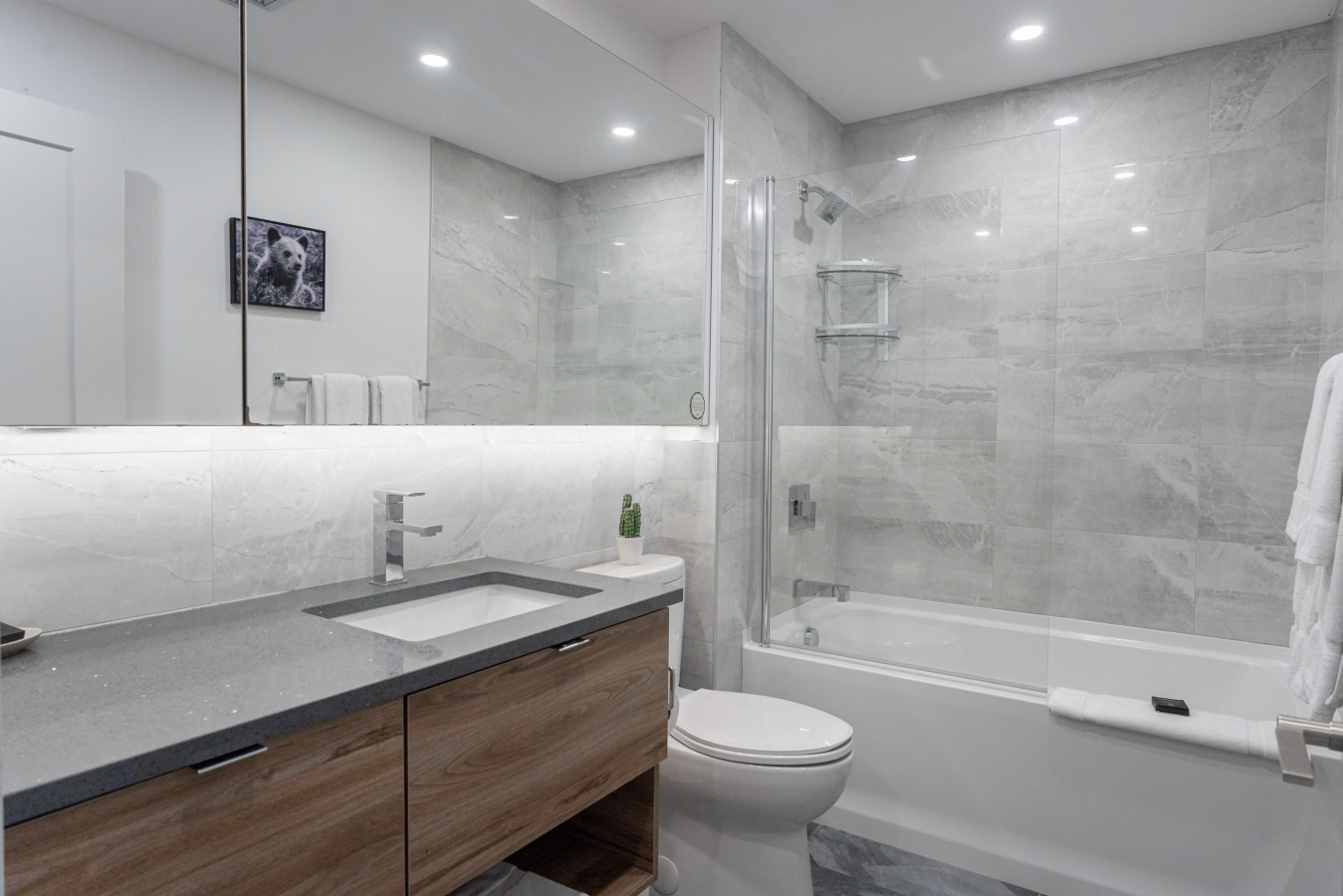 Enjoy restful nights in the one bedroom, featuring a comfortable queen-size bed and ample closet. The modern bathroom is designed for relaxation and convenience, with stylish vanities, fresh towels, and essential toiletries.