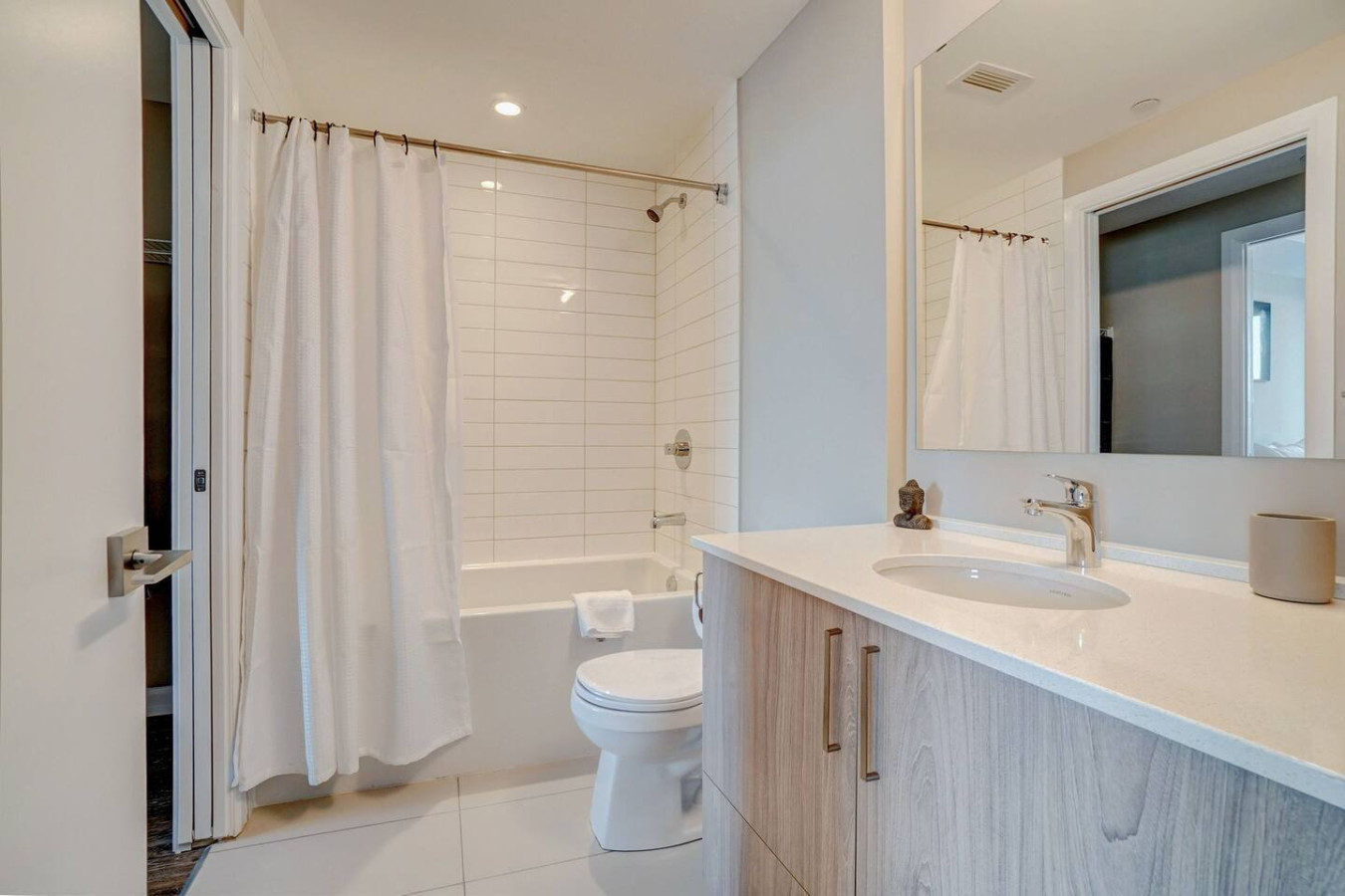 Relax in the generously sized bedroom, thoughtfully styled for ultimate comfort. The luxurious Queen-size bed is complemented by elegant nightstands and a large window, framing beautiful skyline views. The bathroom exudes sophistication, featuring a stylish vanity, a sleek glass-door shower or bathtub, and fresh towels and premium toiletries.