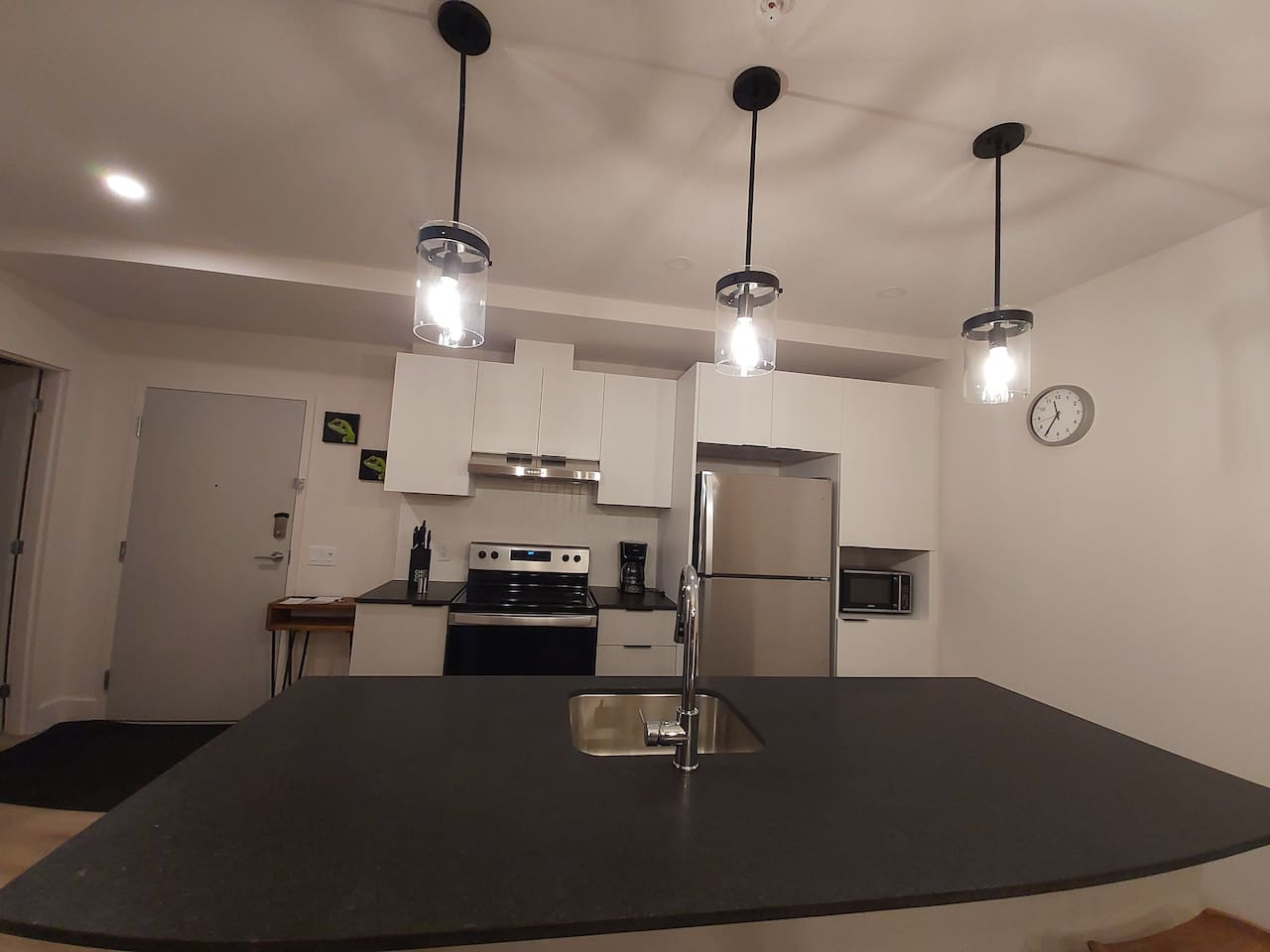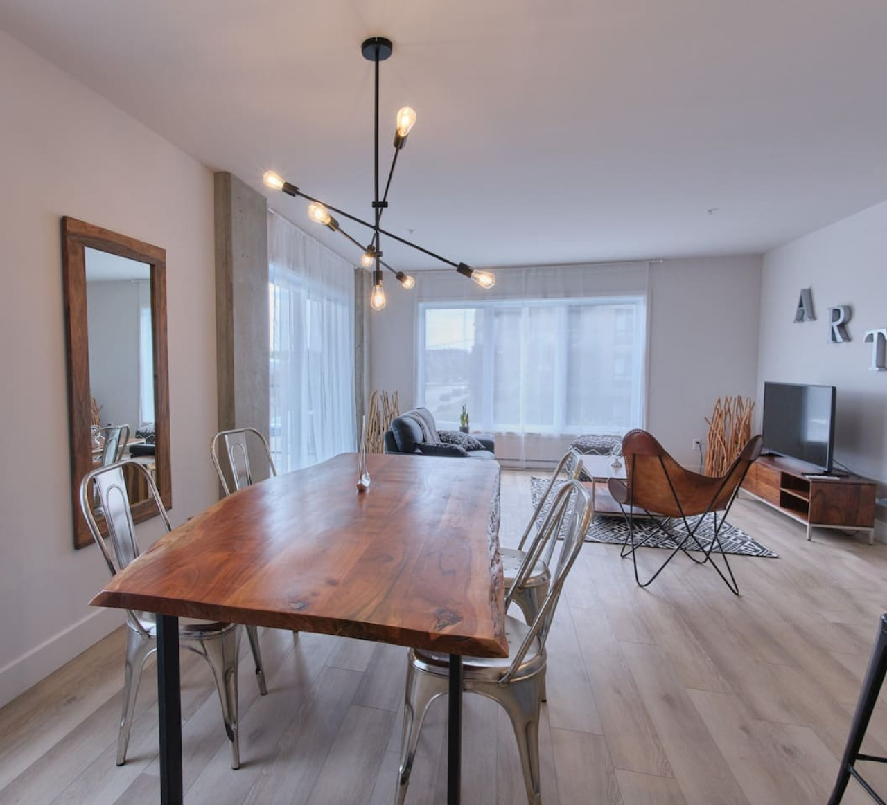 Step into a spacious and elegant living area that offers a welcoming ambiance. With an open-plan design, this space invites relaxation and provides stunning views of Québec City’s skyline. Relax on the comfortable sofa, enjoy your favorite shows on the Smart TV, or simply soak in the panoramic views after a day of exploration.