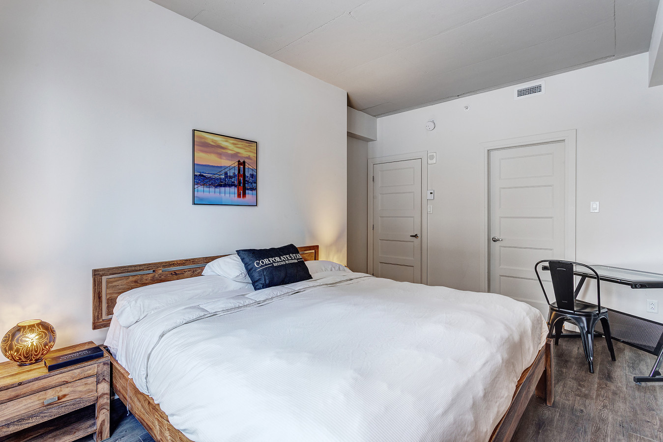 Rest comfortably in a tranquil bedroom featuring a queen-size bed and neighborhood views. The full bathroom includes high-end fixtures for a refreshing and comfortable experience.