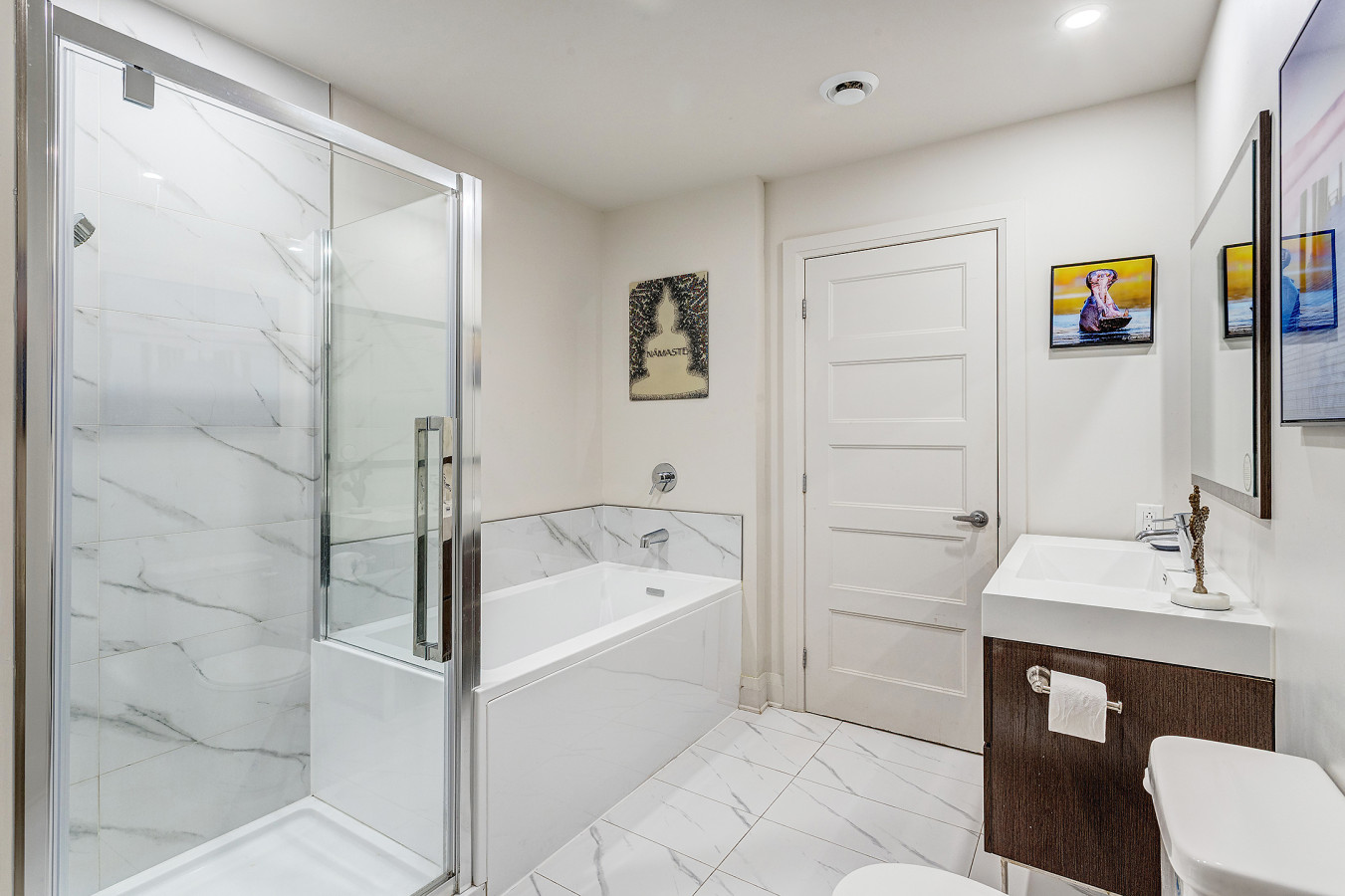 – Modern full bathroom with a sleek bathtub–shower combo