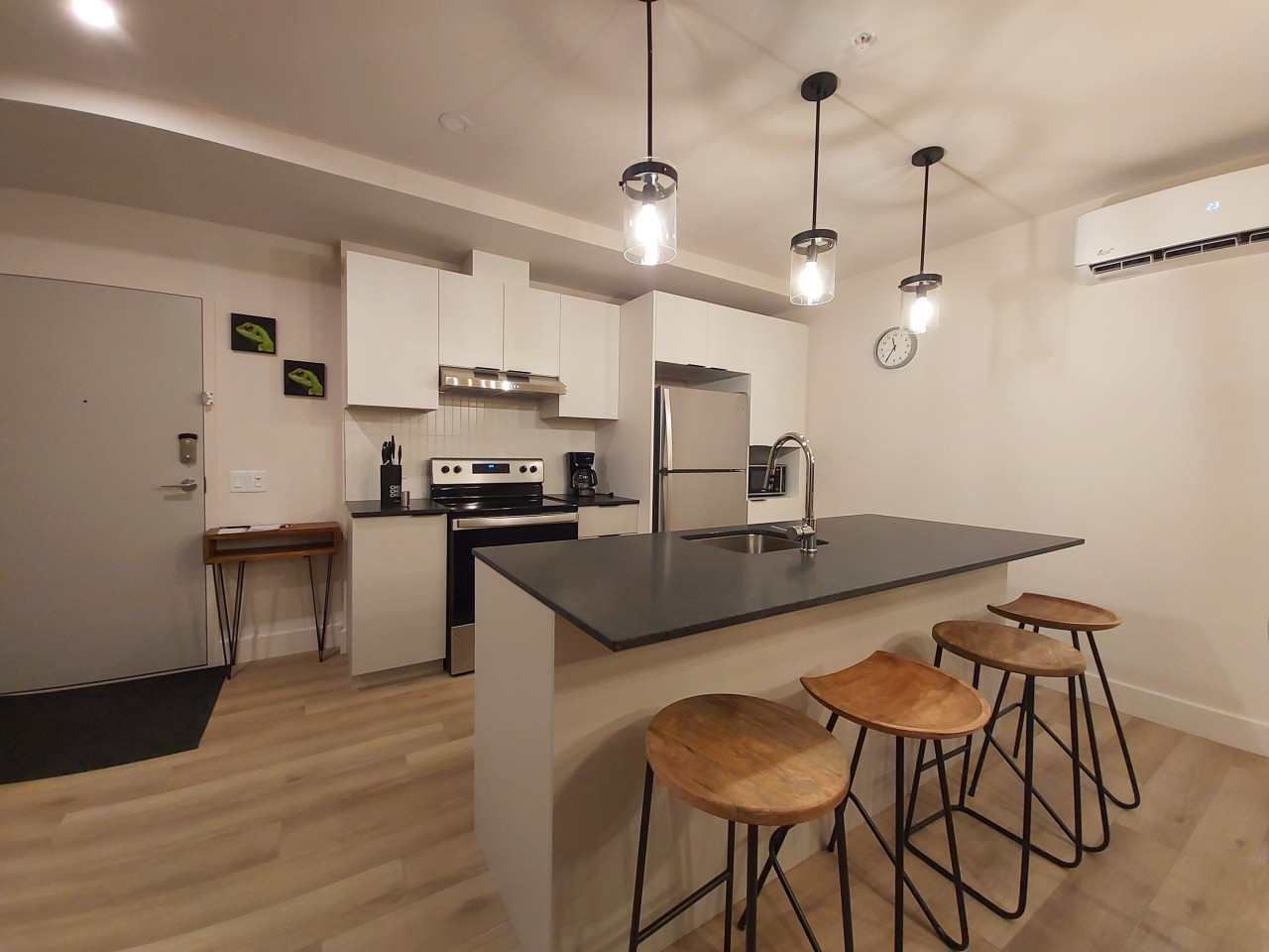 Enter into a spacious and stylish living area, offering a welcoming ambiance and open-plan design. This inviting space showcases beautiful views of Québec City’s skyline. Unwind on the cozy sofa, enjoy a show on the Smart TV, or simply enjoy the panoramic views after a day of exploration.