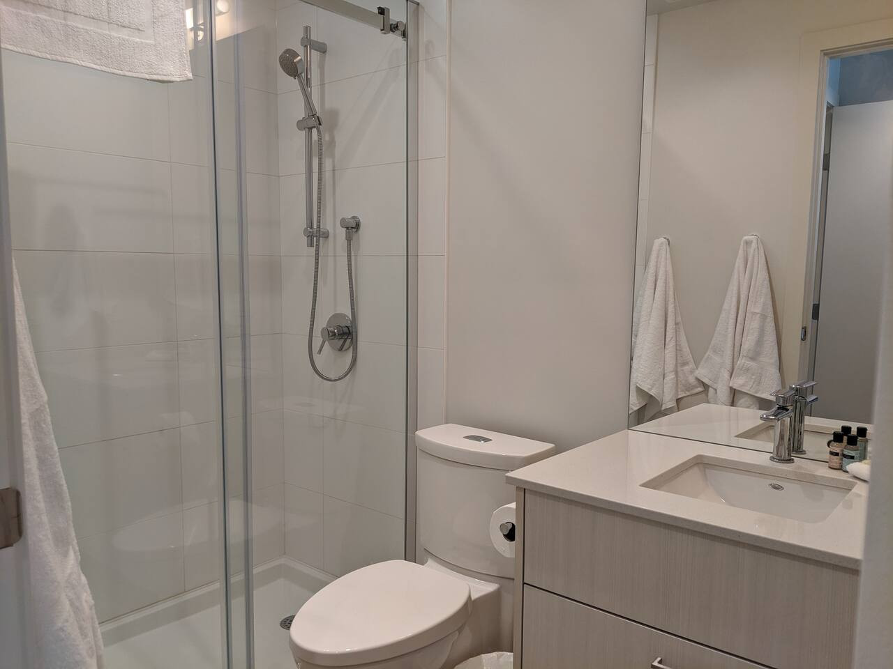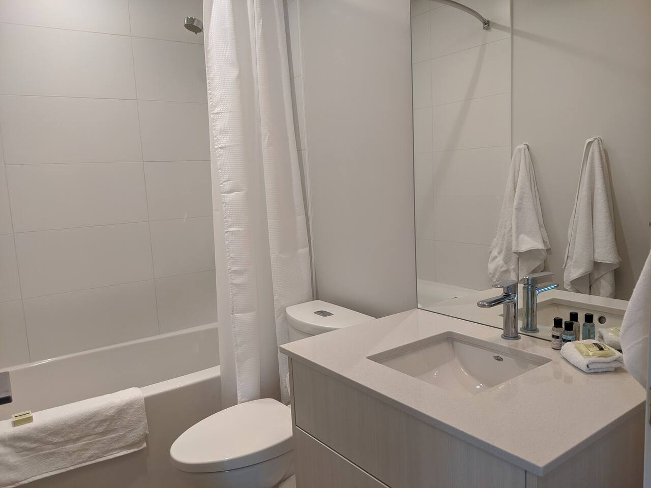 The spa-like bathrooms feature a sleek vanity and either a luxurious bathtub or a stand-alone shower (depending on the unit). Fresh towels, starter toiletries, and a convenient hairdryer are provided to enhance your comfort during your stay.