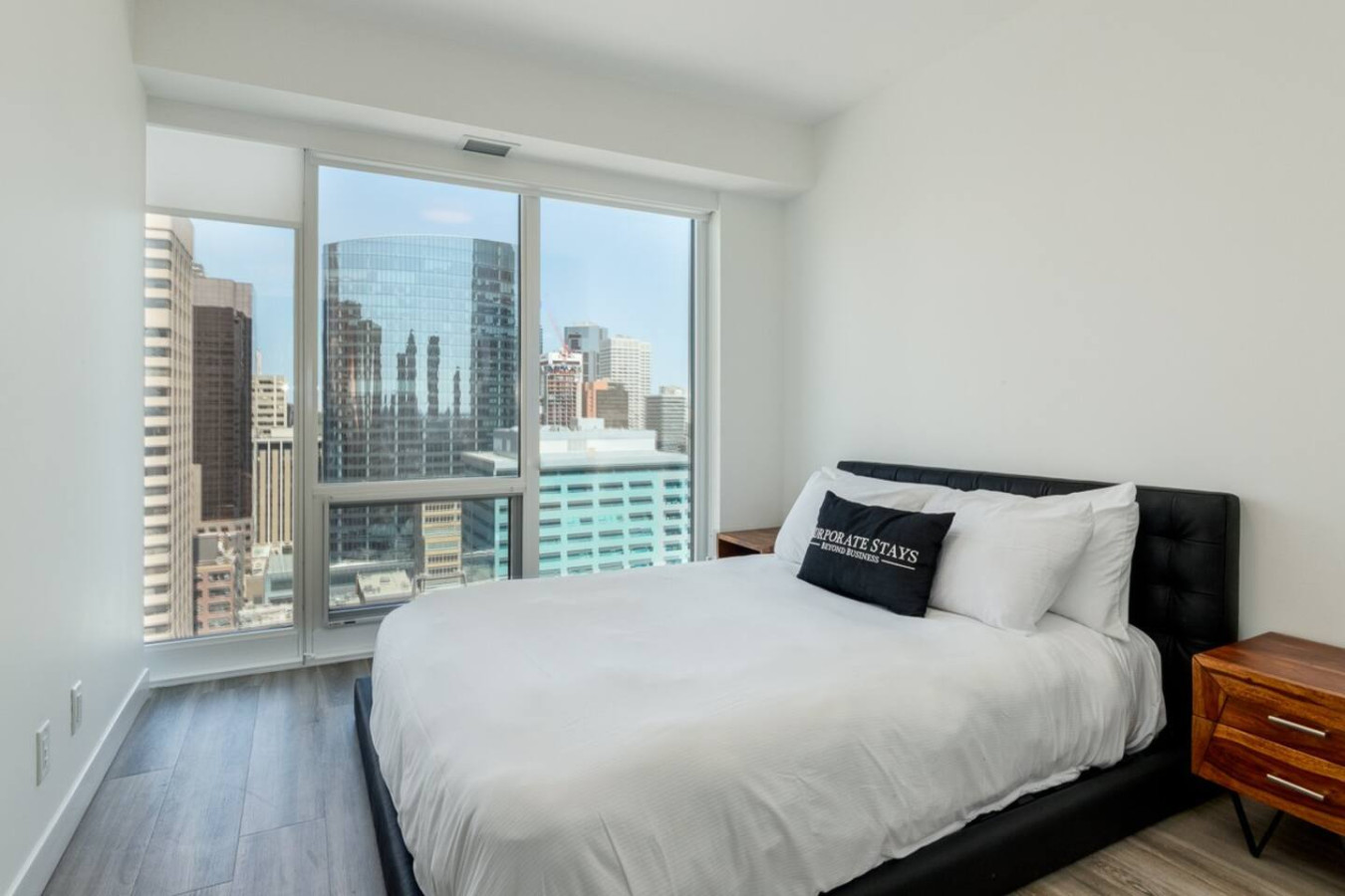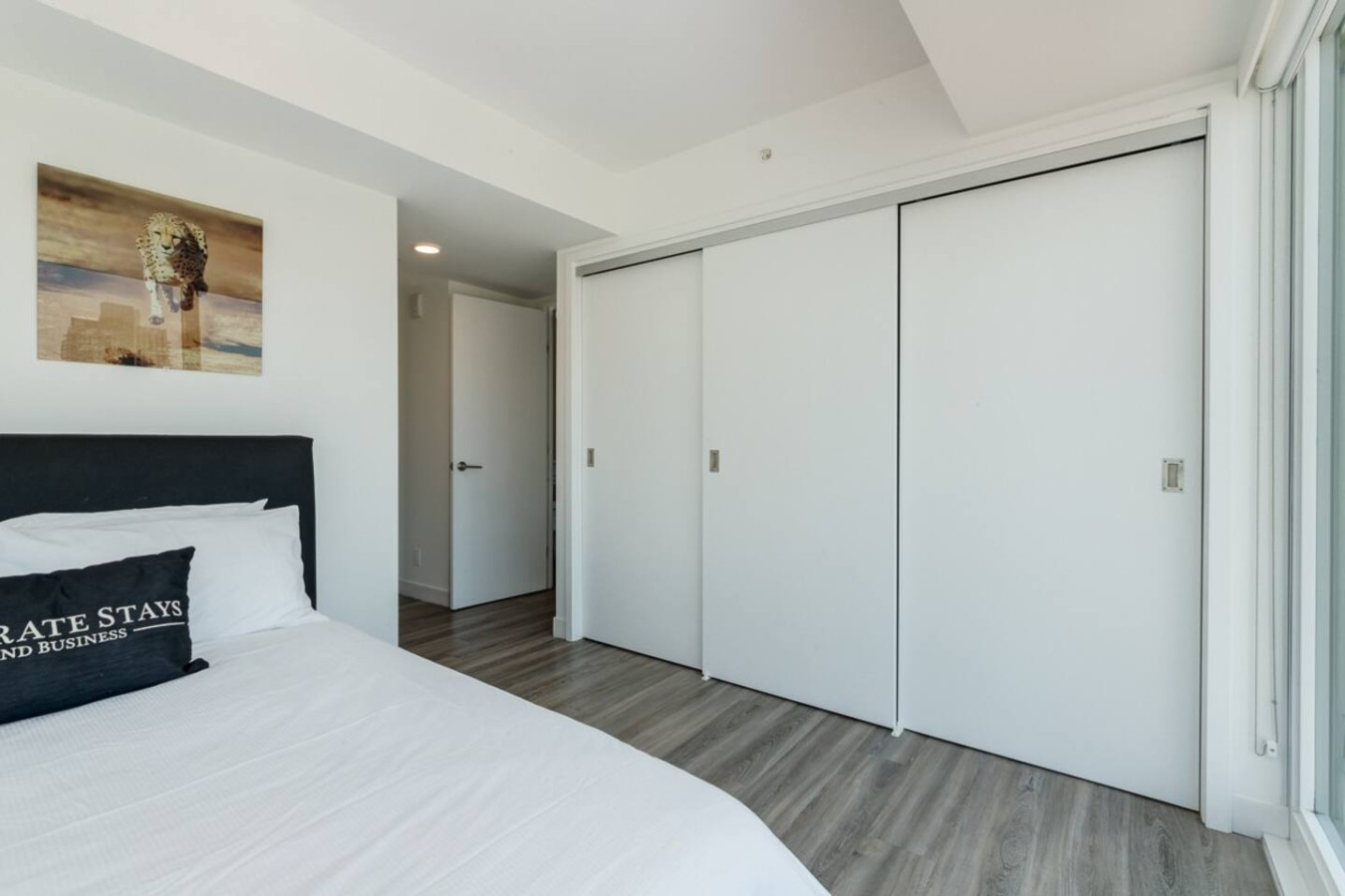 This apartment features two elegant bedrooms. The primary bedroom is a luxurious retreat, boasting expansive skyline views and an ultra-comfortable queen-size bed, complemented by stylish nightstands and a spacious walk-in closet. A private laundry area adjoins the bathroom for added convenience.