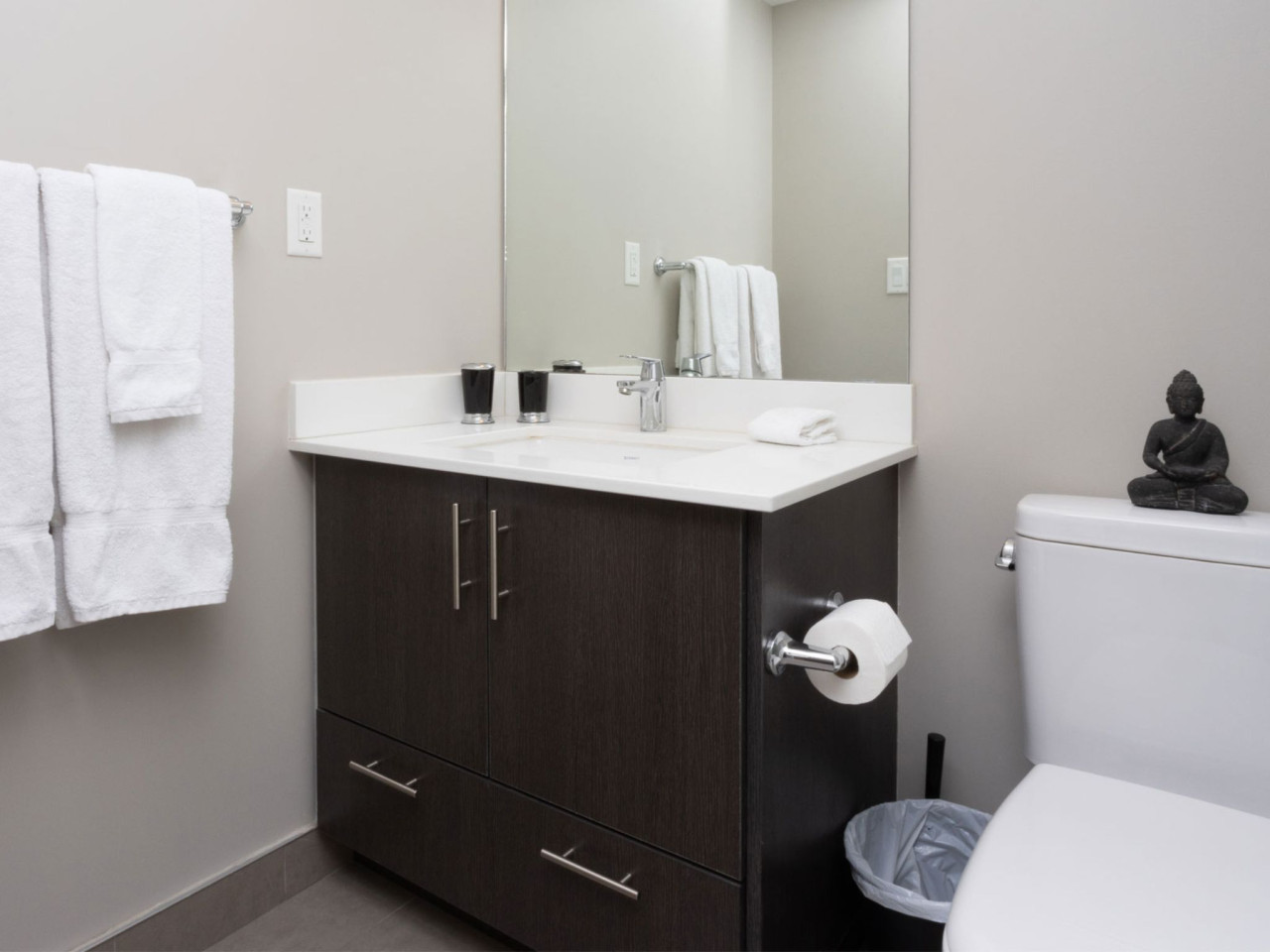 This apartment offers two serene bedrooms, each thoughtfully designed with comfort and relaxation in mind, with one offering scenic views of Edmonton's lively Oliver neighborhood for a peaceful retreat. The sleek, modern bathrooms are equipped with high-end fixtures and all the essentials, ensuring a refreshing and rejuvenating experience.
