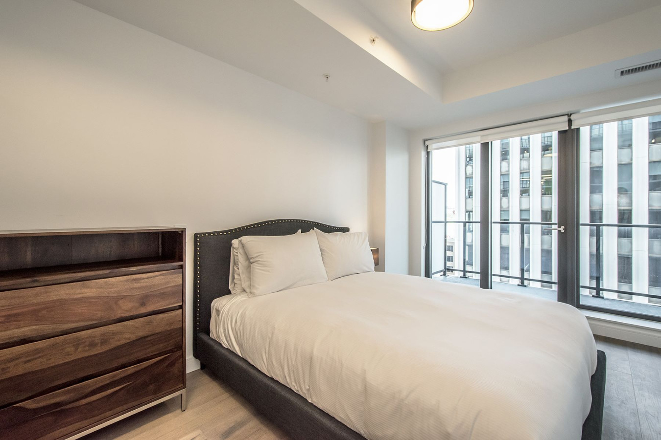 Retreat to the cozy and serene bedroom with a queen-size bed, offering stunning views of the skyline. The modern bathroom is designed for ultimate comfort, featuring a sleek vanity, plush towels, and essential toiletries to start your day feeling refreshed.