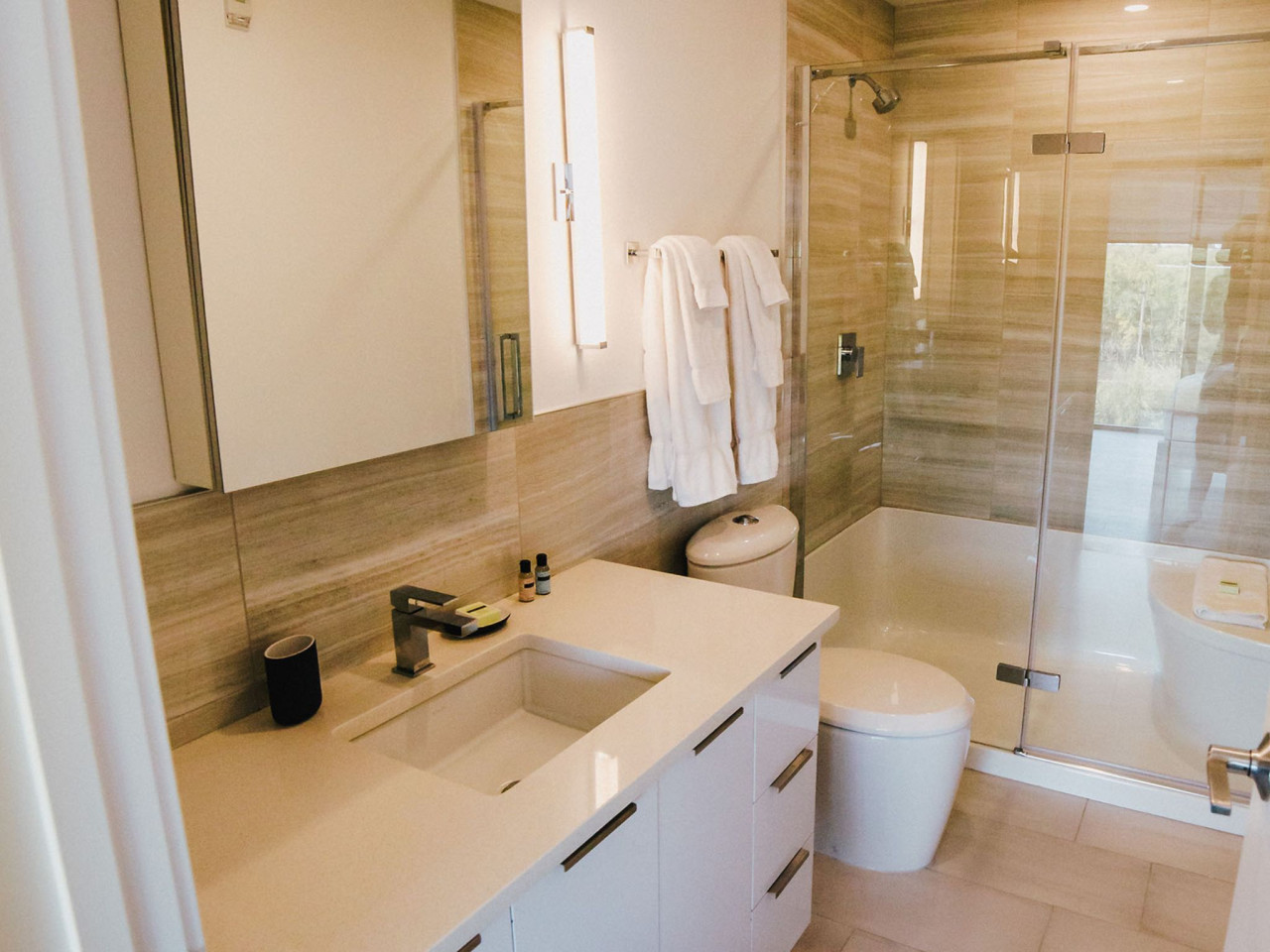 This apartment features two tranquil bedrooms, each offering peaceful neighborhood views for restful nights. The well-appointed bathrooms include high-end fixtures and spacious layouts, perfect for relaxation. One bathroom features a rejuvenating stand-alone shower and modern vanity, while the second offers the same luxurious finishes, making it ideal for added convenience and comfort.