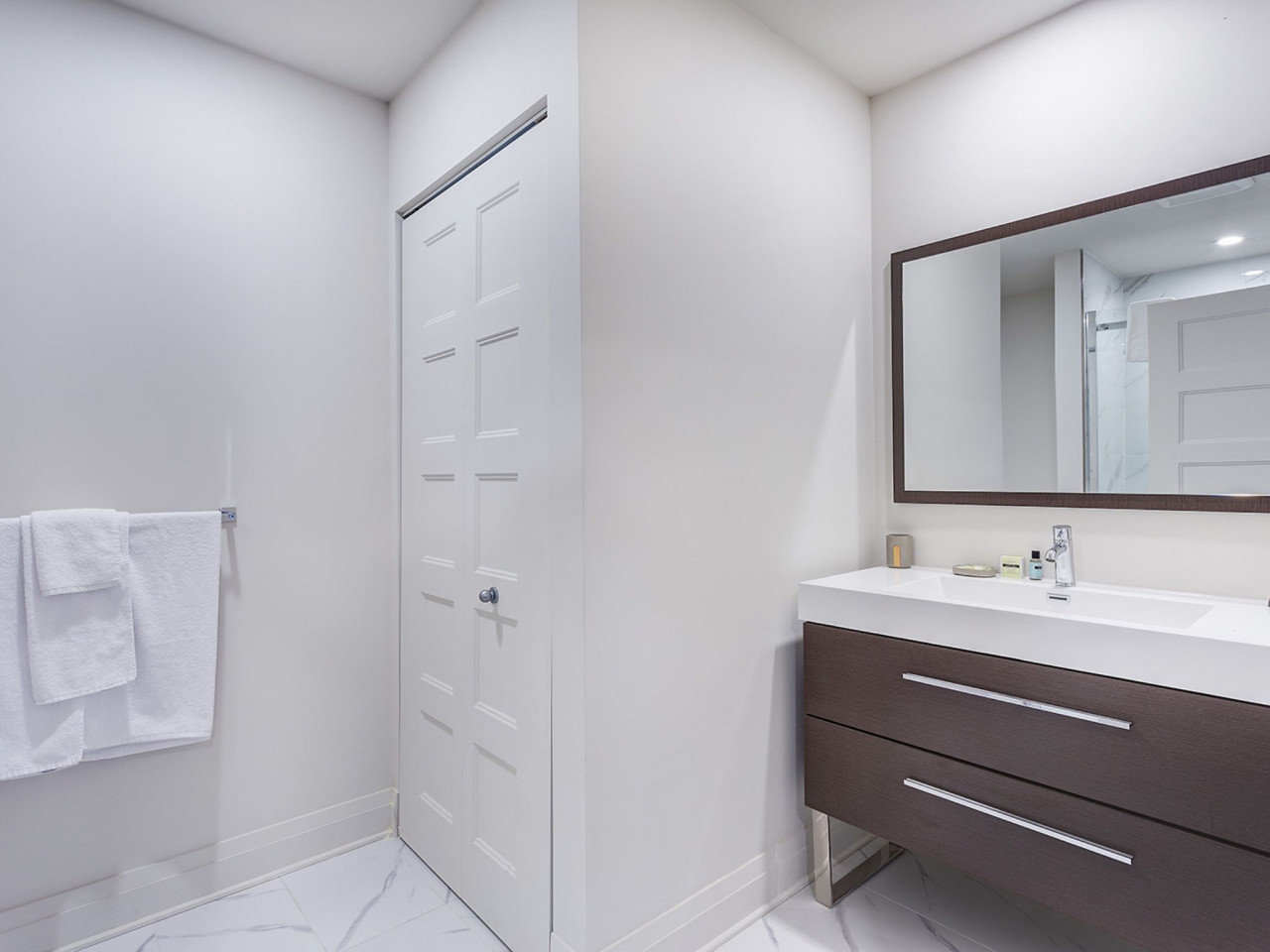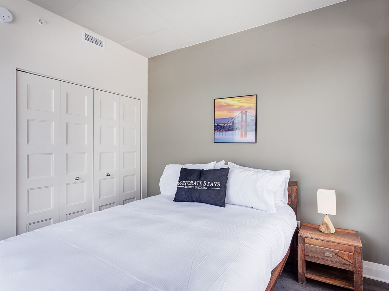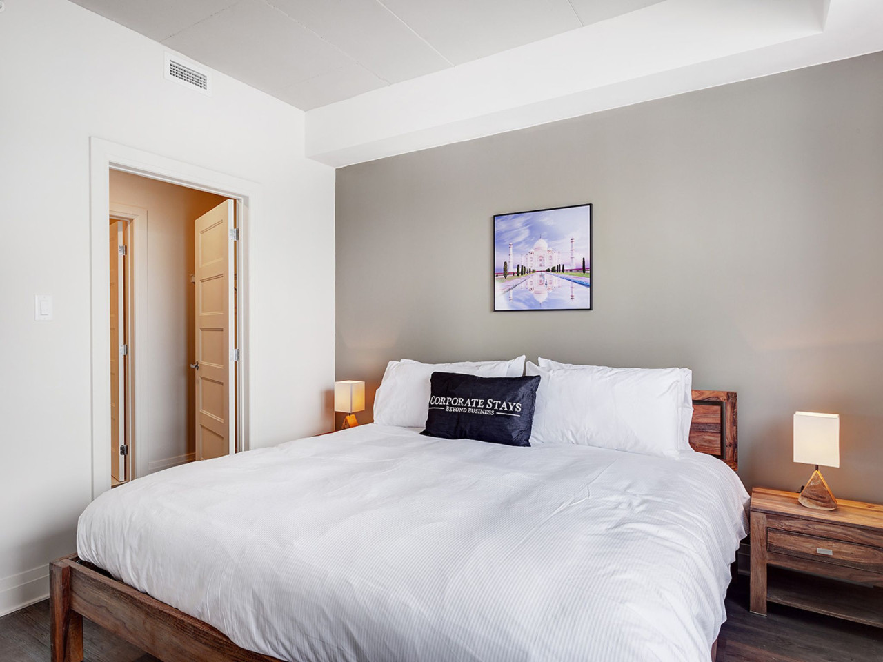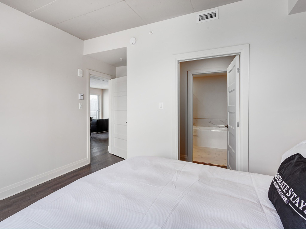 Rest comfortably in a tranquil bedroom featuring a queen-size bed and neighborhood views. The full bathroom includes high-end fixtures for a refreshing and comfortable experience.