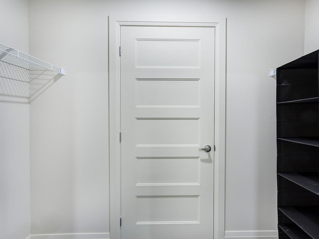 – Primary bedroom features a king-sized bed, an ensuite bathroom, and storage space