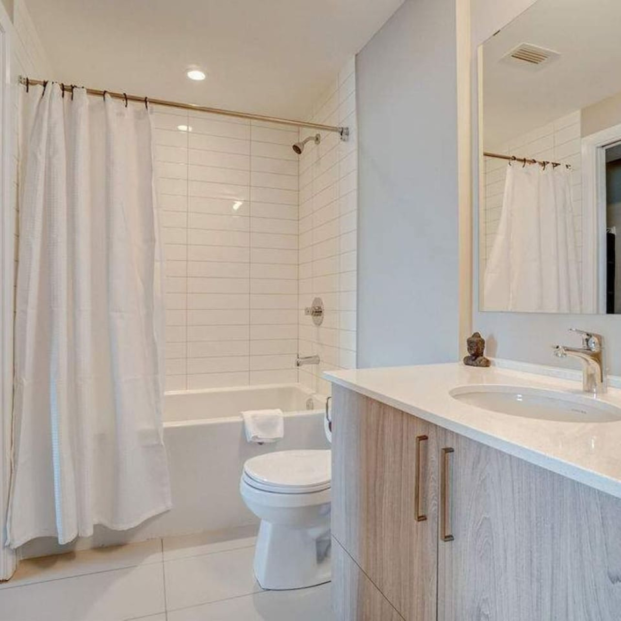 The bathroom features a stylish vanity and a glass-door shower/bath-tub (in some units), complete with fresh towels and toiletries for your convenience.