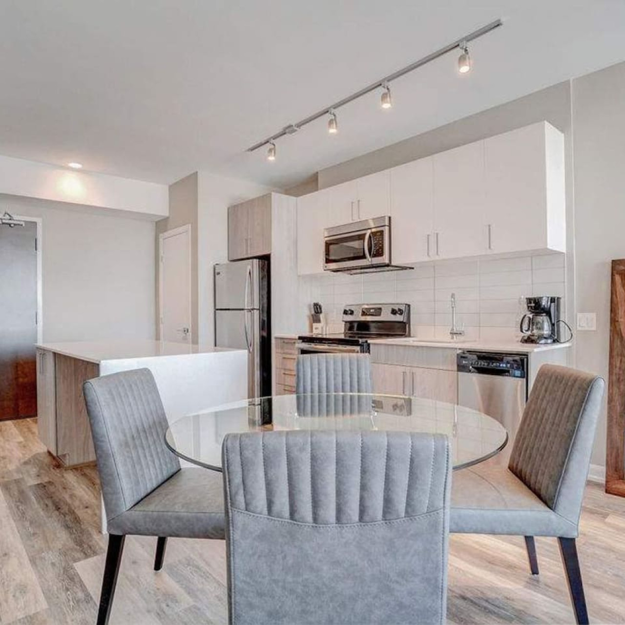 Step into a bright and spacious living room that provides a serene retreat from the moment you enter. Elegantly furnished, this inviting space features a comfortable couch, a stylish floor lamp, and a Smart TV—perfect for unwinding after a day of exploring the city. The dining area, illuminated by warm lighting, seats four and is ideal for enjoying meals together.