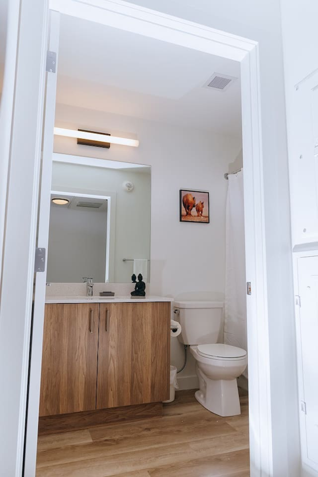 Rest easy in the tranquil bedroom featuring a queen-size bed and scenic neighborhood views. The modern bathroom is equipped with all essentials, offering a relaxing start or end to your day.