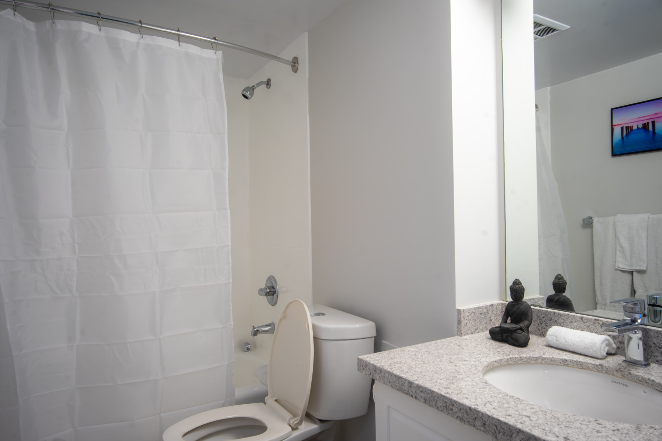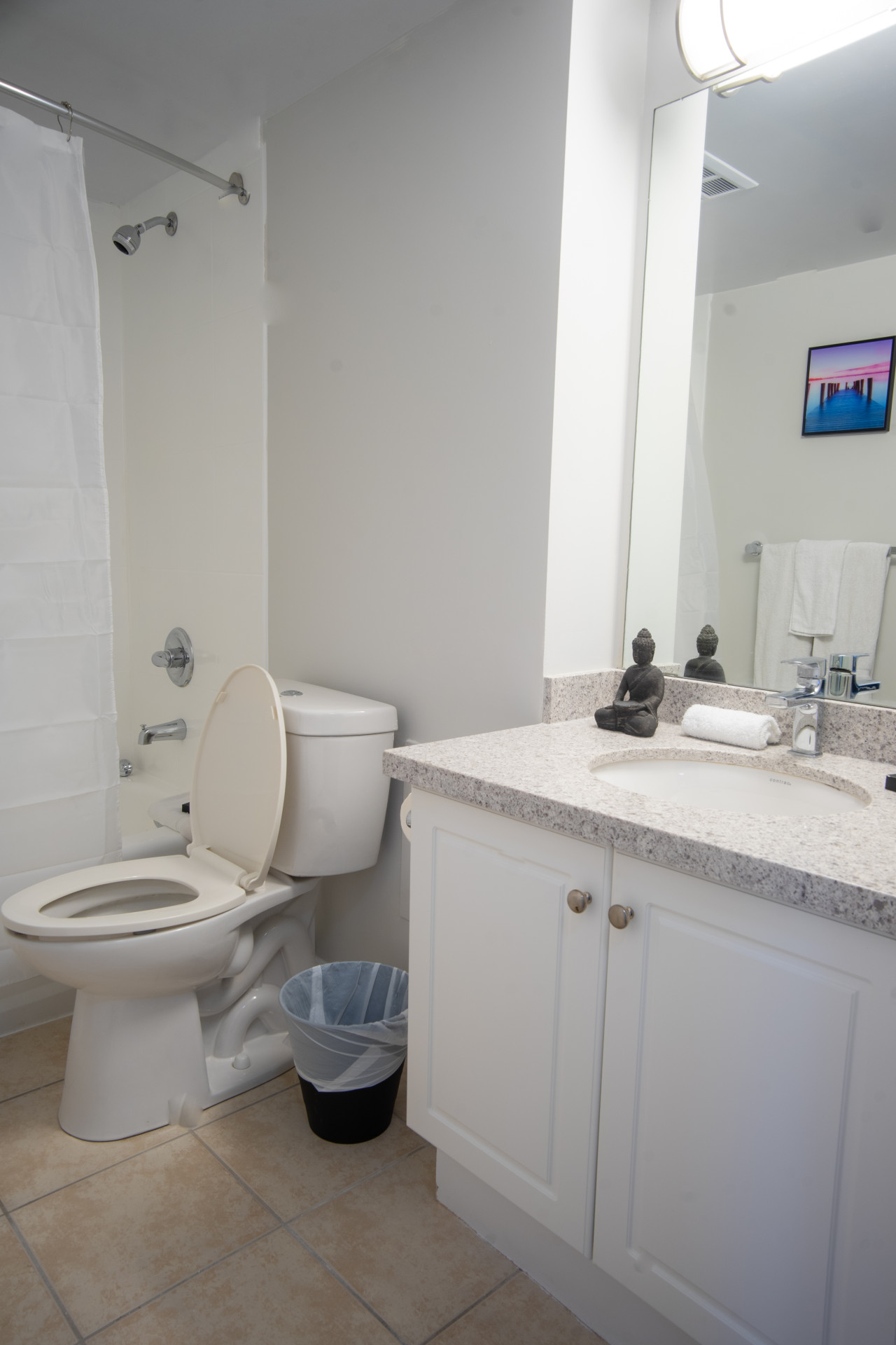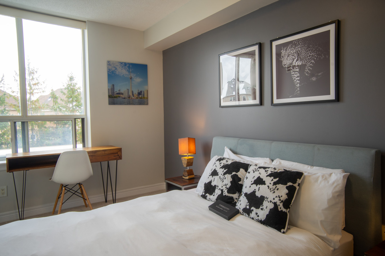 This apartment offers a tranquil bedroom, featuring a queen-size bed and scenic neighborhood views for restful nights. A full bathroom with high-end fixtures provides the perfect setting to refresh and rejuvenate.