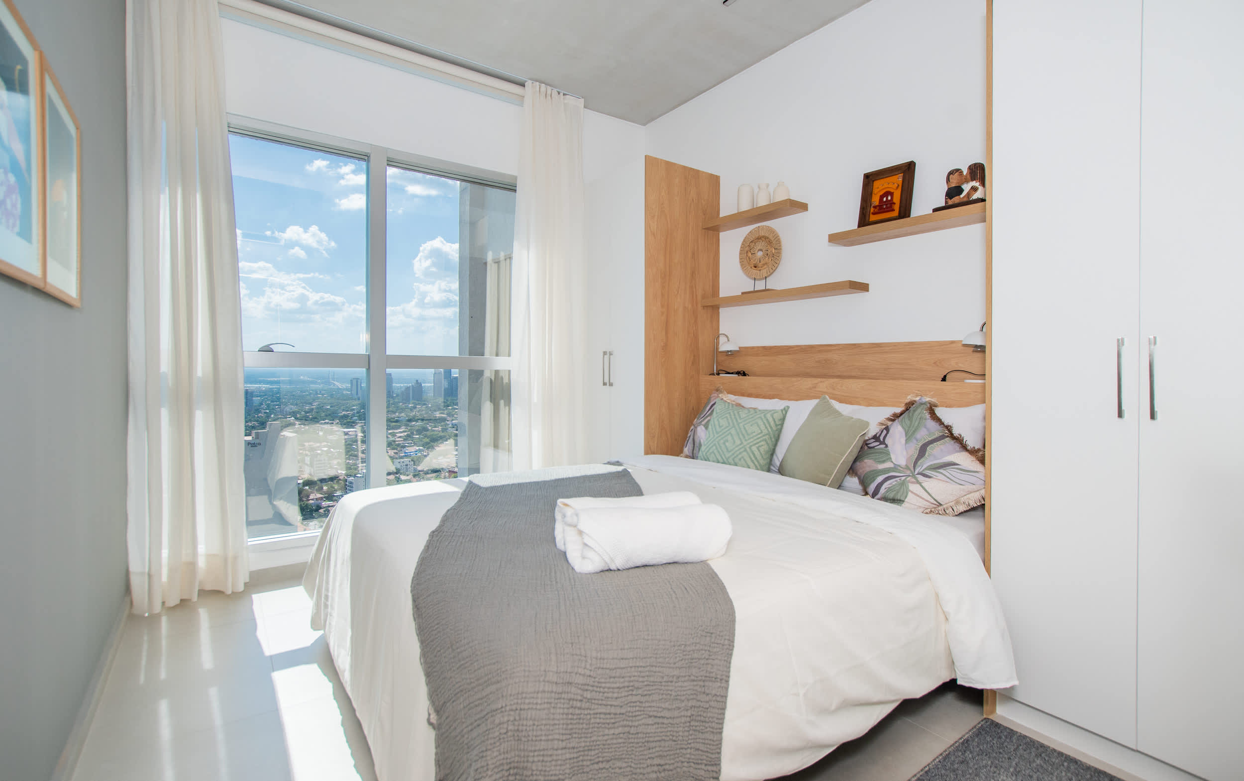 This thoughtfully designed 1BR unit offers a cozy yet modern atmosphere with everything you need for a seamless stay. Enjoy a comfortable bedroom, a bright living area, and a fully equipped kitchen ideal for short or long stays. Floor-to-ceiling windows provide stunning panoramic views of the city skyline—especially magical at sunset.