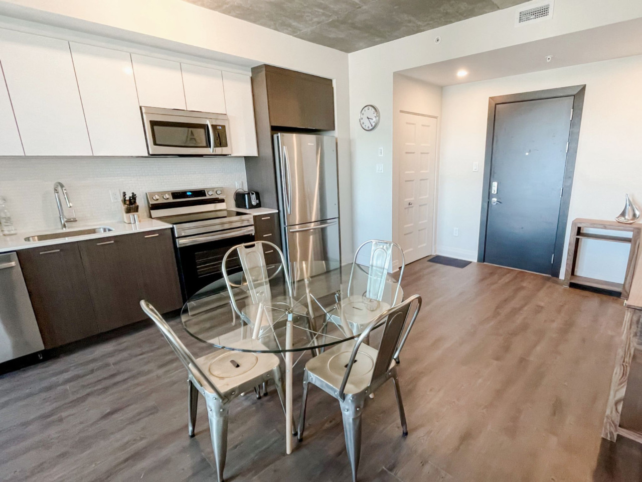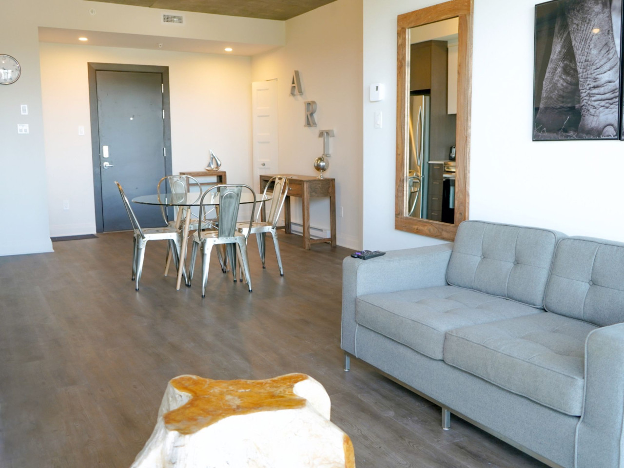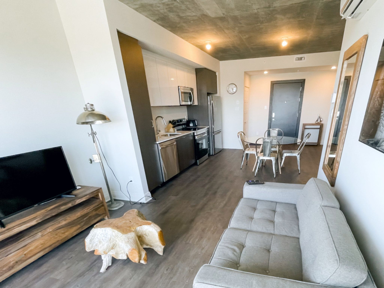 Welcome to your stylish and luxurious home away from home Step into a beautifully designed living space that seamlessly connects to a spacious, open-concept kitchen and dining area, all while showcasing breathtaking skyline views of Montreal. Relax on the plush couch, catch up on your favorite shows on the Smart TV, or simply admire the stunning cityscape—perfect for unwinding after a day of exploring. Every detail in this elegant retreat combines comfort with sophistication, ensuring a memorable stay in the heart of the city.