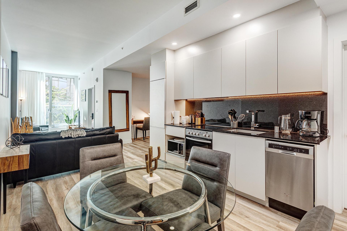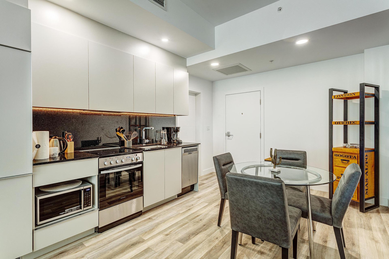 Step into your modern one bedroom business rental in Montreal. Enjoy elegant interiors with 9′ ceilings and designer finishes. Your utilities and high-speed Wi-Fi are included, plus an in-suite washer/dryer and air conditioning for comfort. Relax or work on the rooftop terrace with stunning city views, stay active in the fitness centre, and get productive in the stylish co-working lounges.