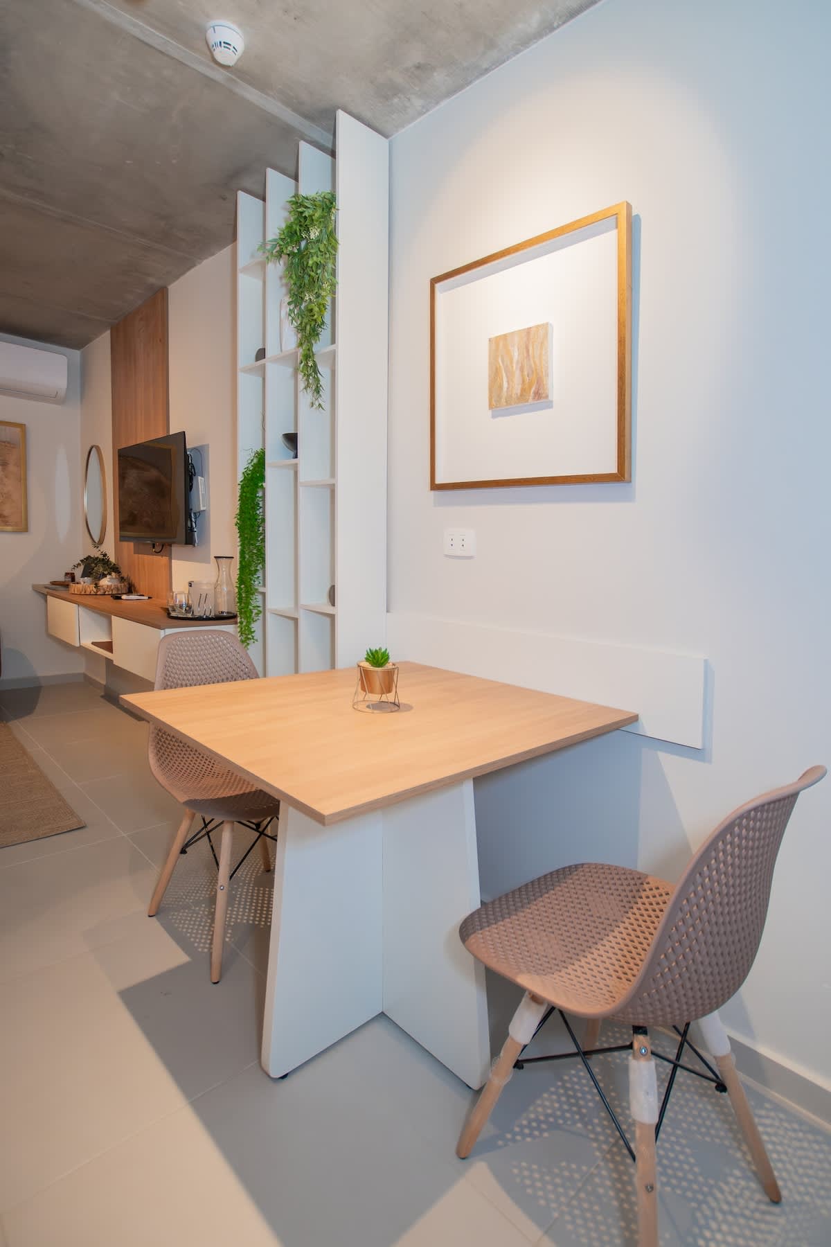 Un monoambiente muy bien puesto, bastante preferible a una habitación de hotel. Super bien ubicado, atrás del Shopping del Sol, a cuadra del Paseo La Galeria. Buenos restaurantes y entretenimiento en la zona, a pasos nada mas.