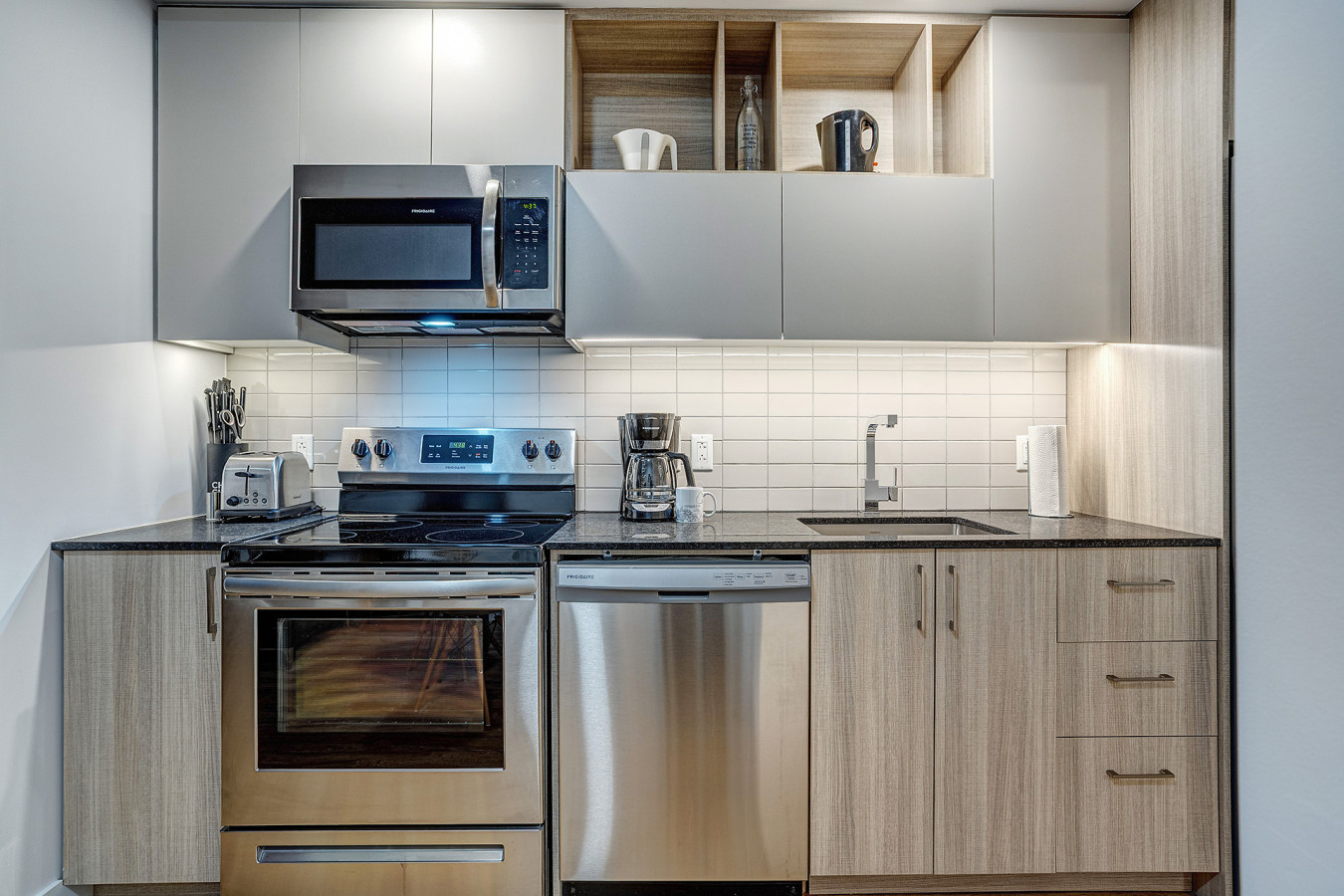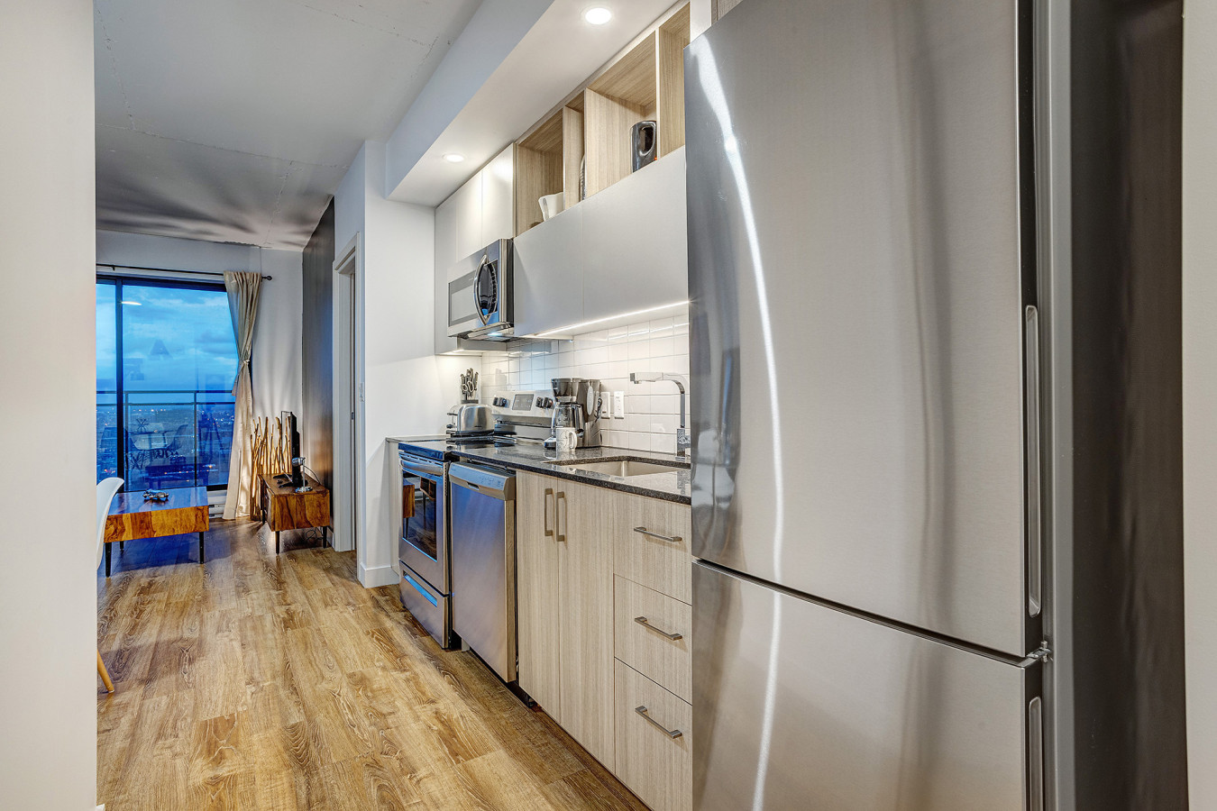 The sleek, modern kitchen includes premium appliances and ample counter space — perfect for preparing anything from quick snacks to full meals. In every serviced 1 bedroom apartment in Montreal by Corporate Stays, the kitchen is designed for convenience and style.