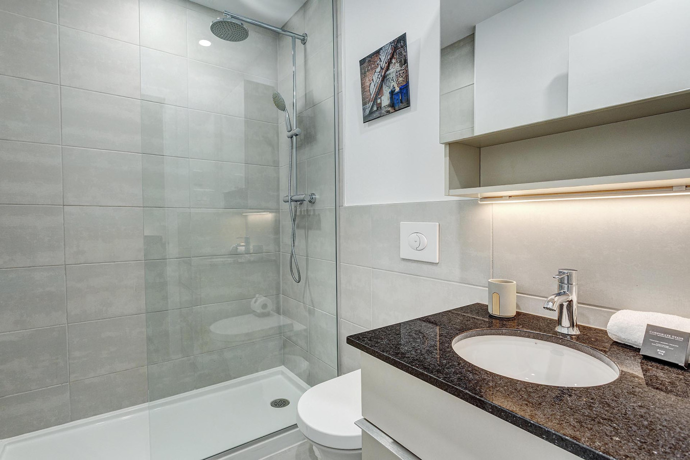 The sleek, modern kitchen includes premium appliances and ample counter space — perfect for preparing anything from quick snacks to full meals. In every serviced 1 bedroom apartment in Montreal by Corporate Stays, the kitchen is designed for convenience and style.