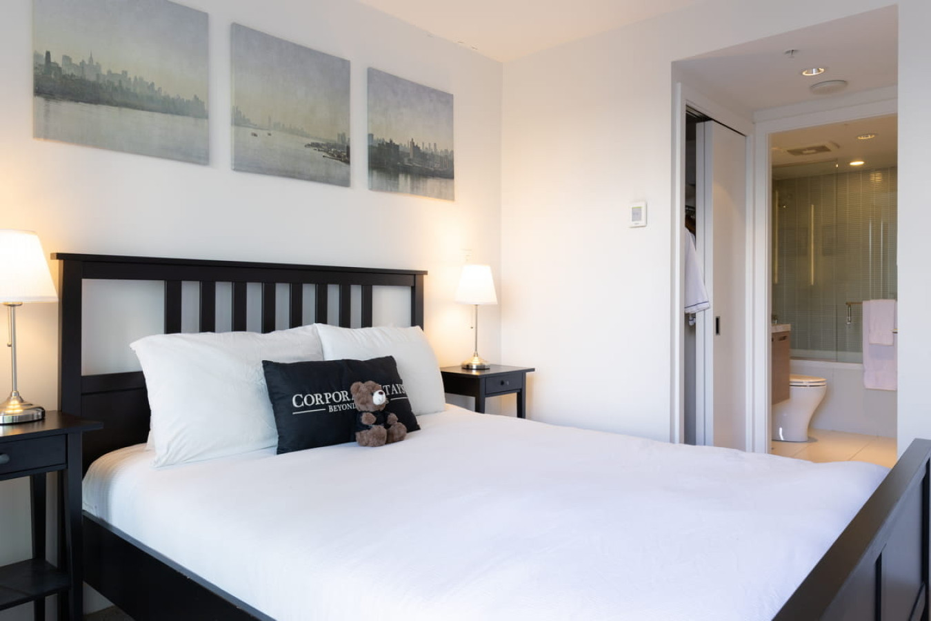 Retreat to the peaceful bedroom with a queen-size bed and impressive city views. The sleek, contemporary bathroom offers all the essentials for a refreshing start or end to your day, with modern fixtures for comfort and relaxation.