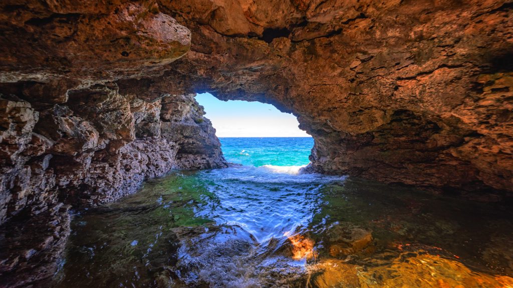The Grotto is a large sea cave filled with a pool of turquoise water. It is carved into the limestone shoreline along the Georgian Bay. The underwater tunnel spans from the pool through the cliff to Georgian Bay. For this reason, a glow appears on the surface of the water on sunny days. In addition, the 30 minute hike to see the Grotto is one of the highlights of the journey for many visitors.