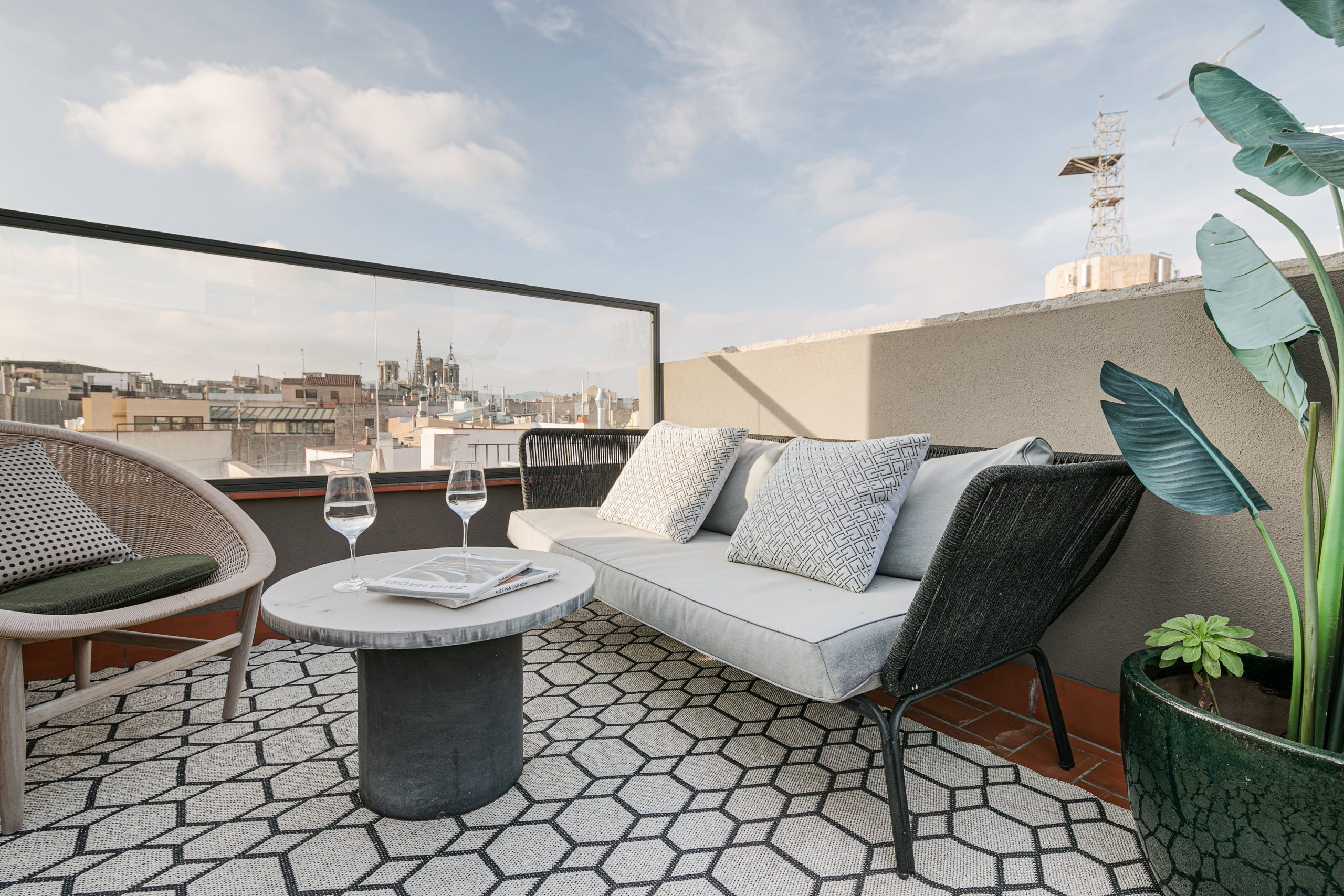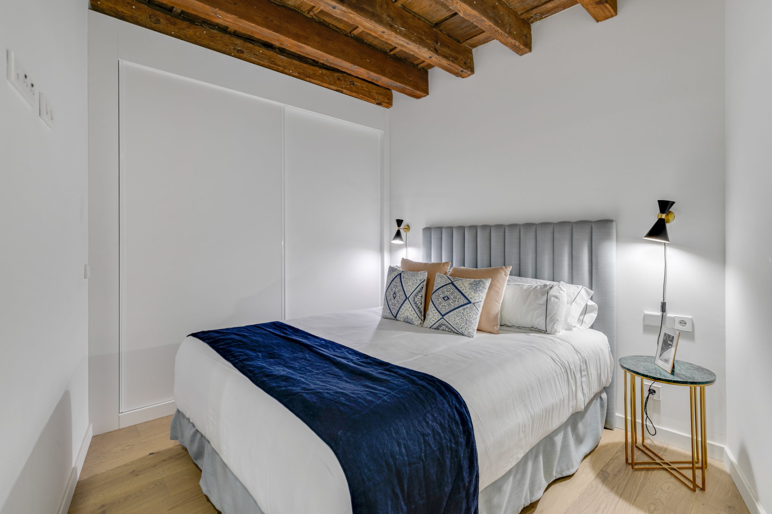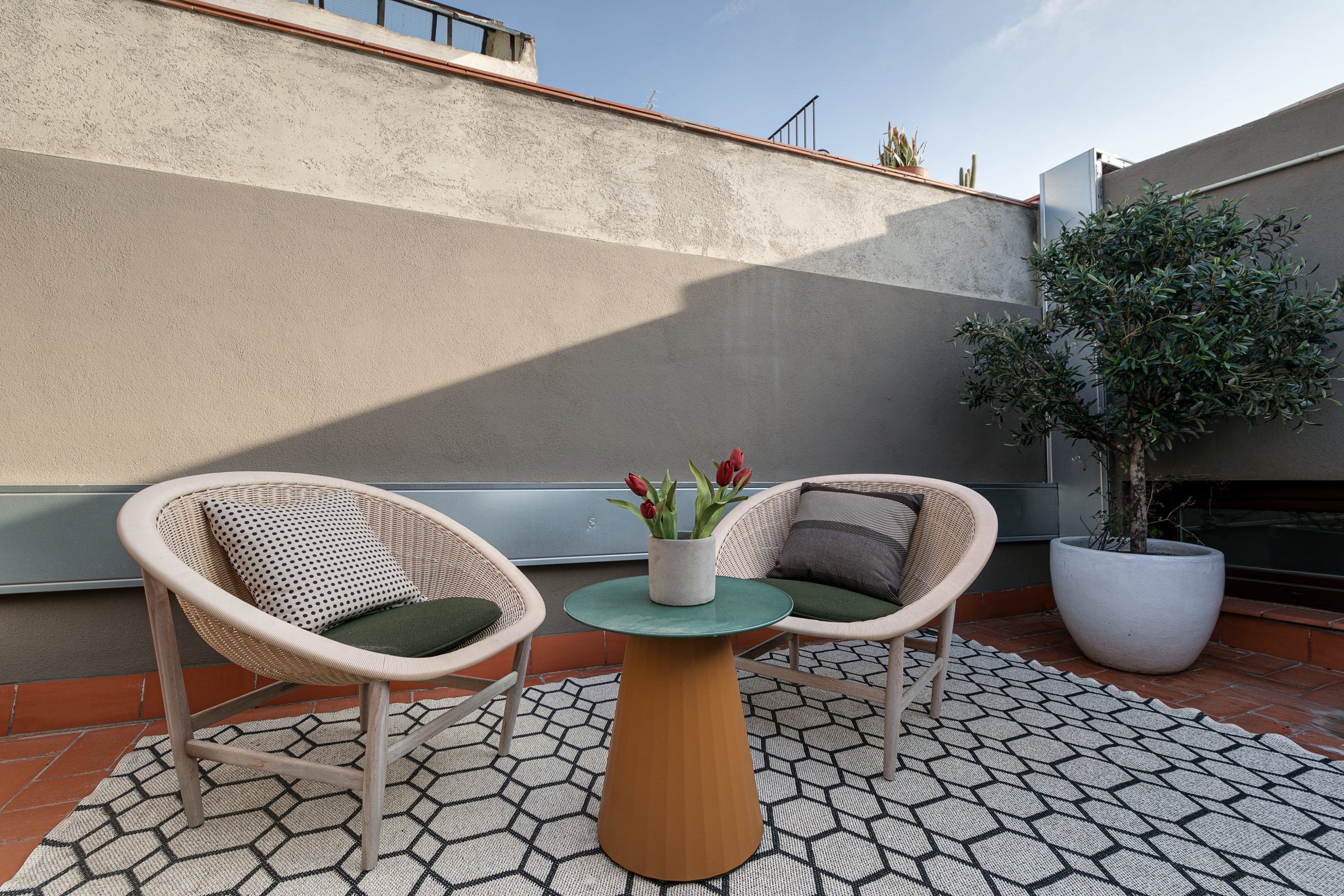 Our stylish apartments in the Gothic Quarter are designed for professionals and digital nomads, with a rooftop area for relaxation. The building is completely refurbished. They are apartments that perfectly combine style and comfort, with 1 bedroom, 1 bathroom, natural light, and a fully equipped and open kitchen connected to the living room. Bursting with the colours of mid-century modern style, its cheeky aesthetics transmits the very spirit of the neighbourhood; the living room with the original wooden ceilings leads into the open-plan kitchen.