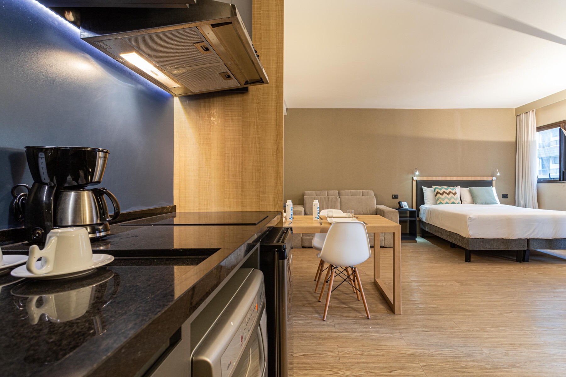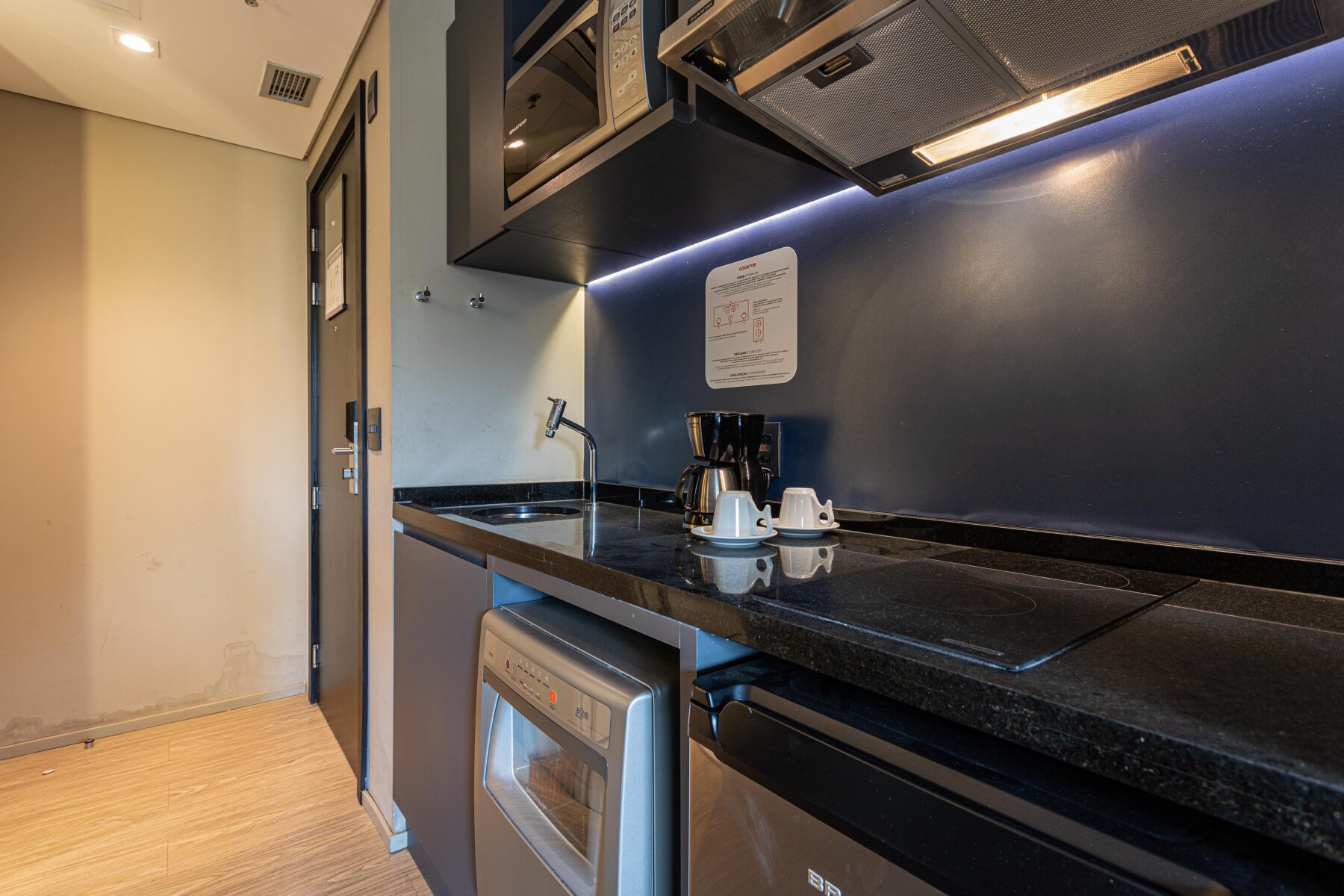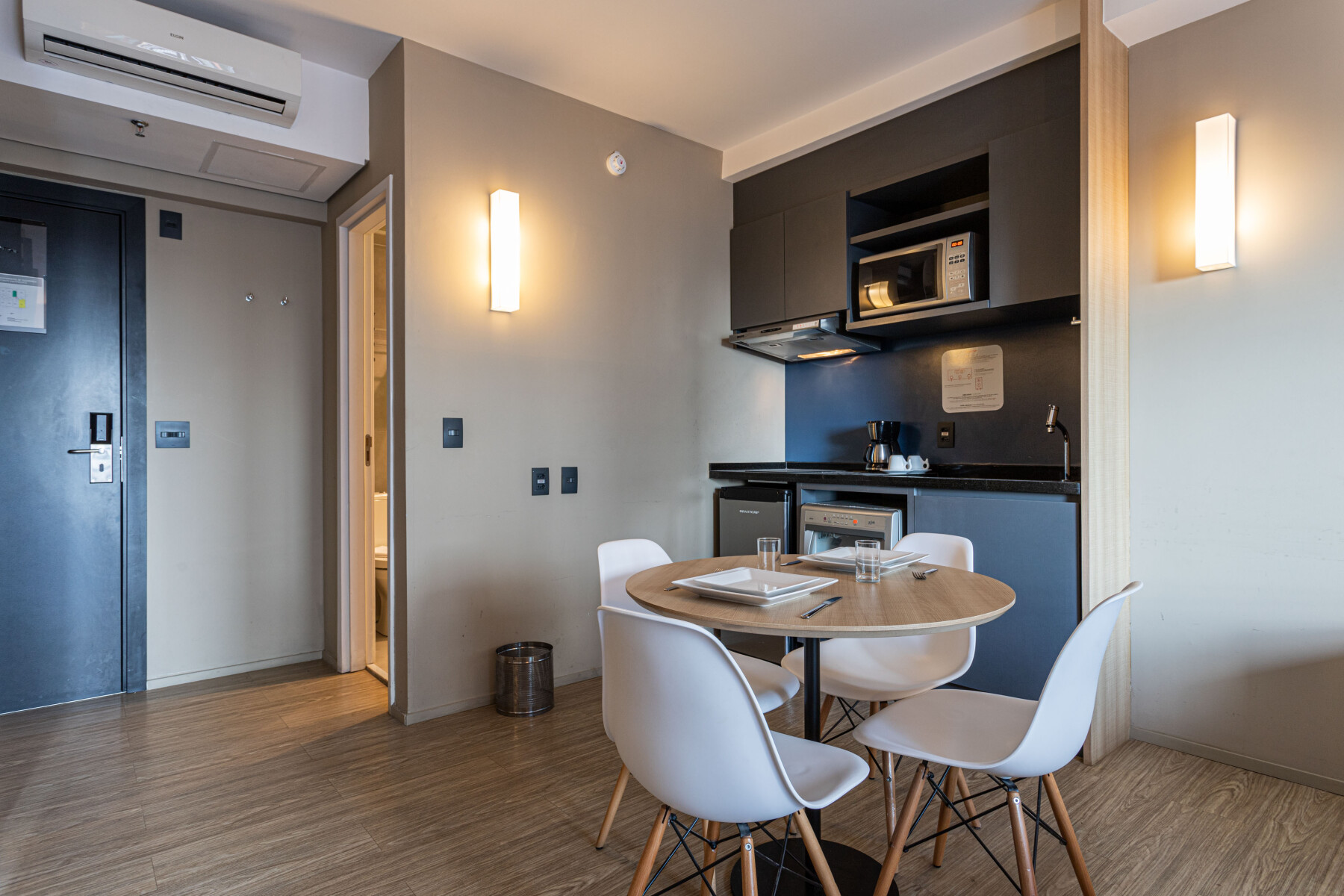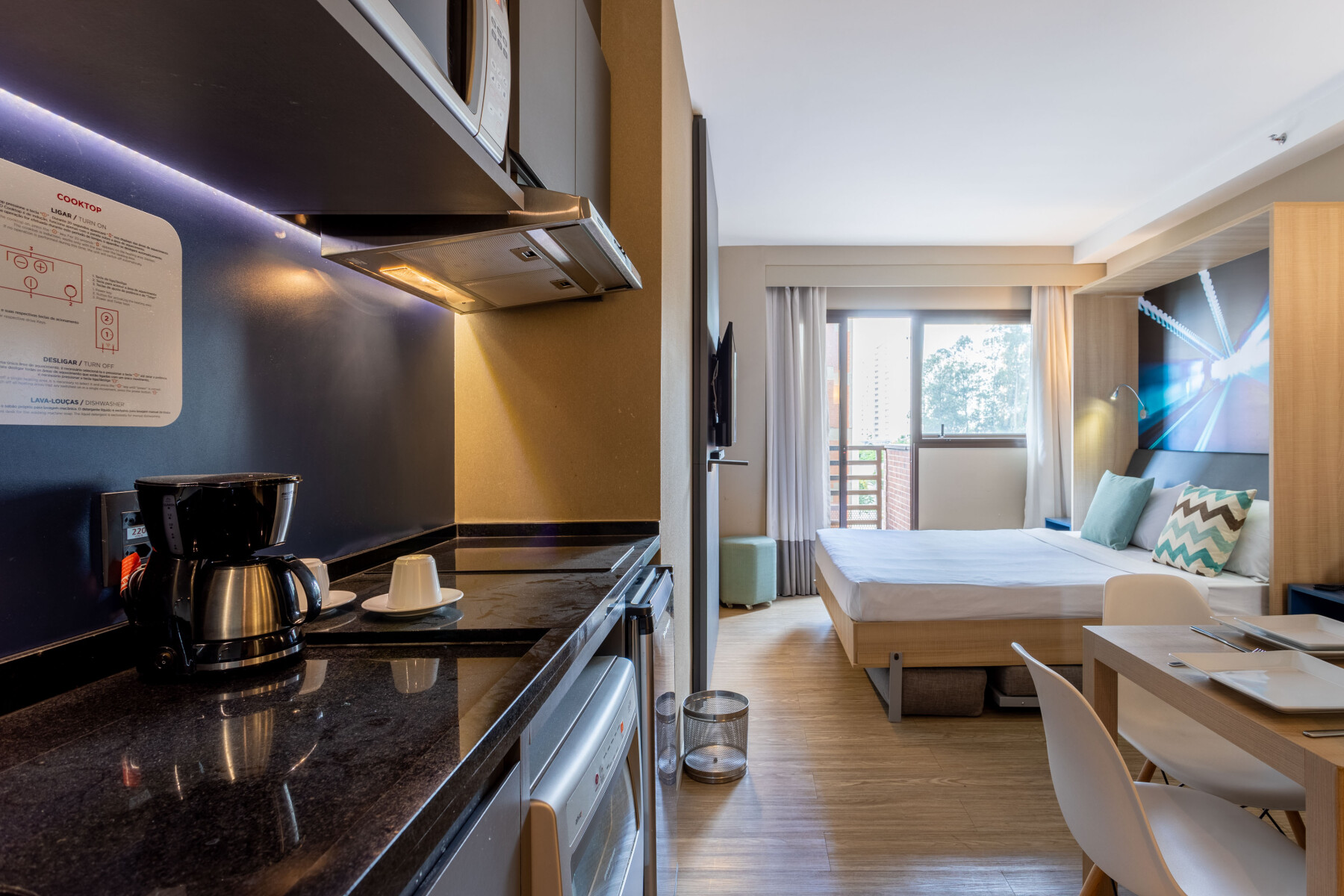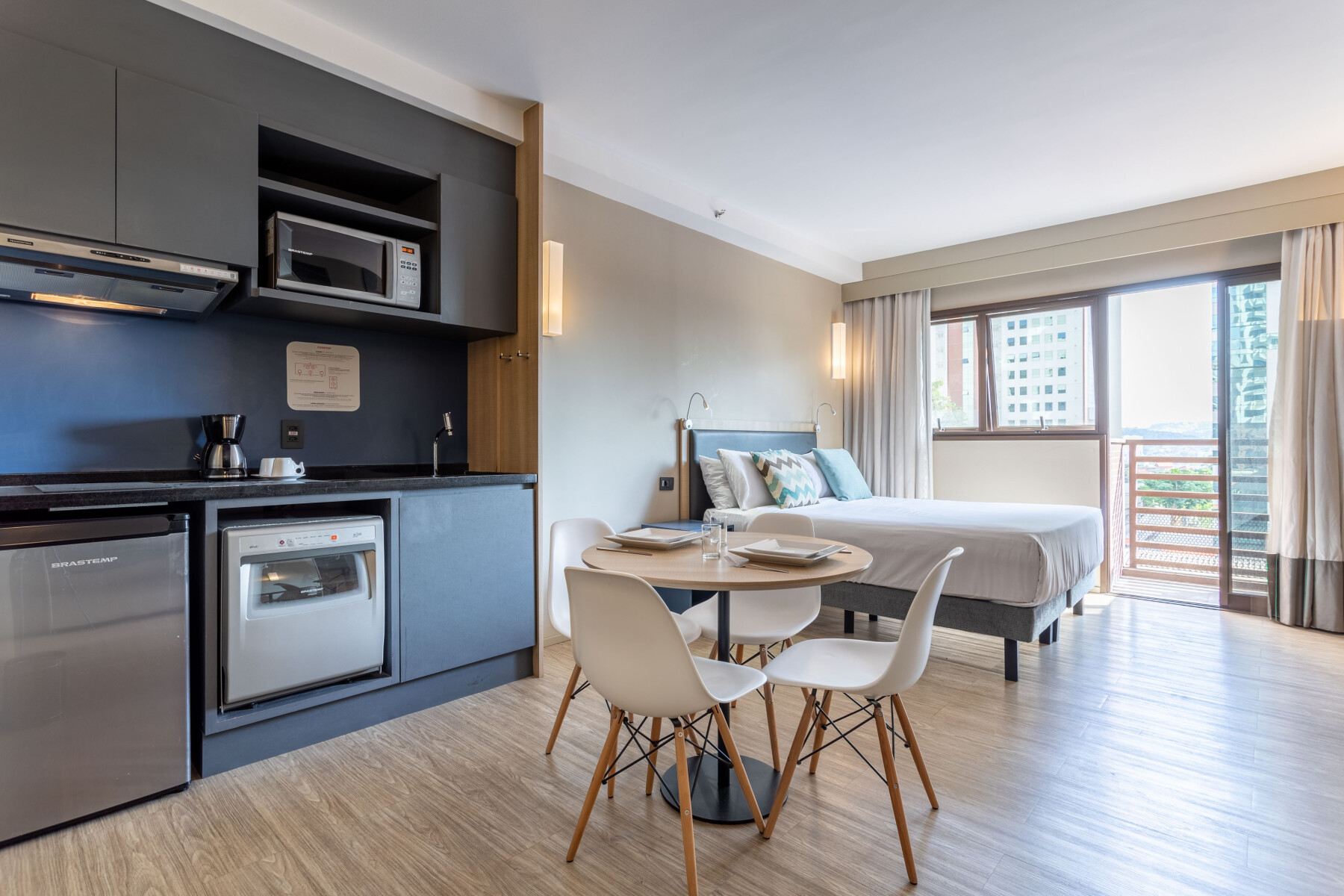 Experience the perfect mix of comfort and convenience at our short-term rentals in Barueri, Brazil. This modern building offers stylish studio and one-bedroom apartments, fully furnished and equipped with premium amenities like high-speed Wi-Fi, a smart TV, and a fully stocked kitchenette.