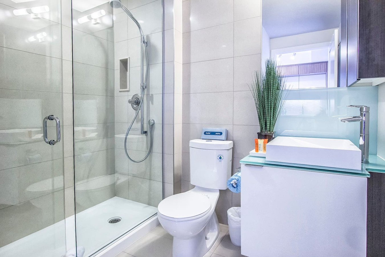 Indulge in the modern bathroom, your personal spa-like retreat, featuring a sleek vanity and either a soothing bathtub or a standalone shower (availability varies). Fresh, luxurious towels and essential starter toiletries ensure a seamless and pampering experience, allowing you to unwind in style.