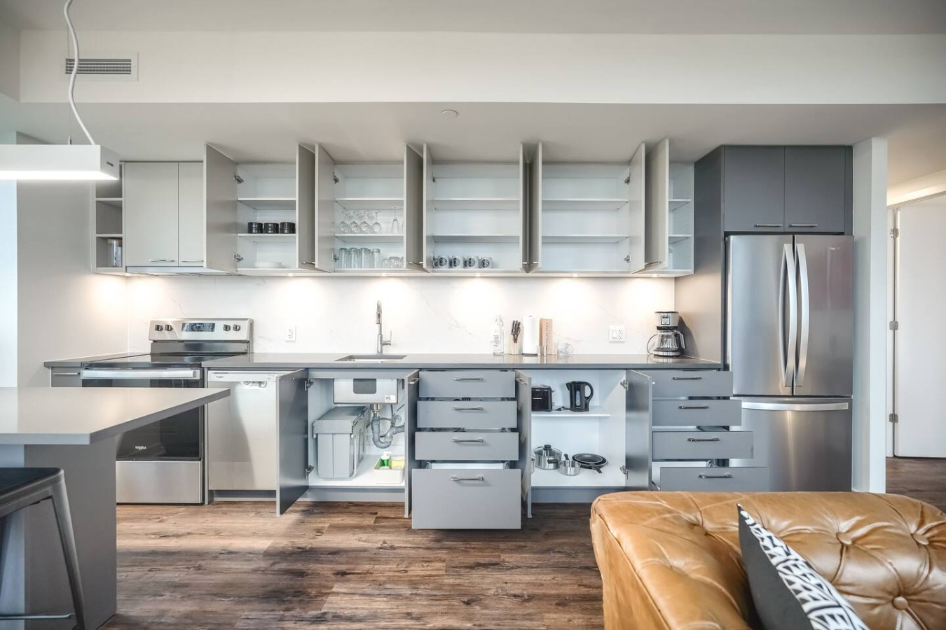 Cook in style in this fully equipped, contemporary kitchen. Featuring sleek countertops, high-end appliances, and ample storage space, it offers everything you need to prepare anything from a quick meal to a gourmet dinner. This well-appointed kitchen ensures that every cooking experience is enjoyable.