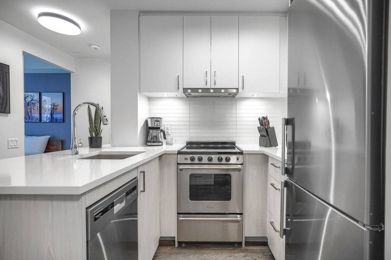 Welcome to your refined retreat in the vibrant heart of Toronto. This beautifully designed living space flows seamlessly into a spacious, open-concept kitchen and dining area, all set against breathtaking skyline views. Relax on the plush, modern sofa, catch your favorite shows on the Smart TV, or enjoy the remarkable cityscape from your private balcony. This serene space masterfully blends elegance and comfort for an unforgettable urban experience.