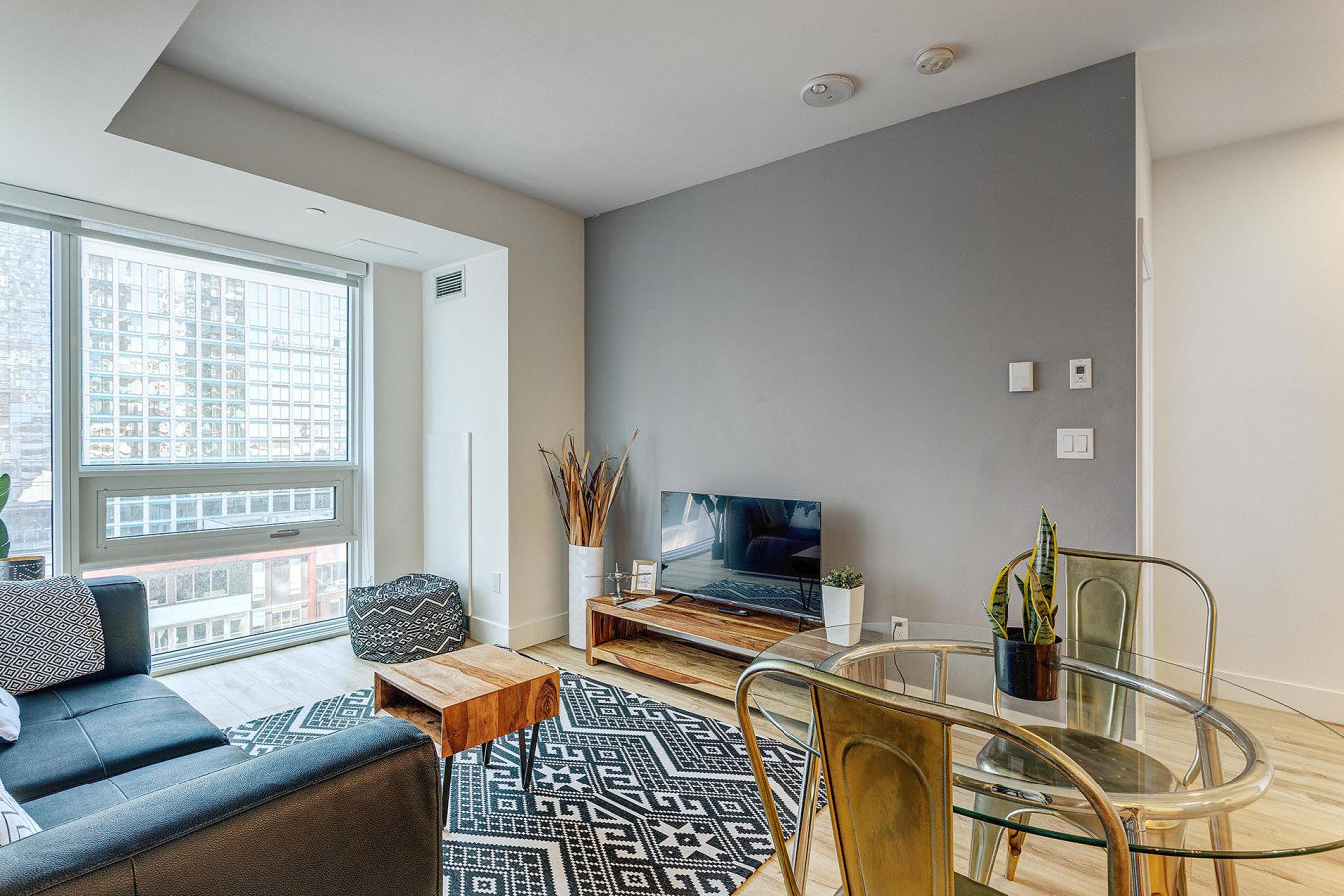 Welcome to your chic and luxurious home away from home! As you step inside, you’ll be embraced by an elegantly designed living space that flows seamlessly into a spacious, open-concept kitchen and dining area, all while showcasing breathtaking skyline views of Montreal. Relax on the plush couch, binge-watch your favorite shows on the Smart TV, or simply gaze out at the stunning cityscape—an ideal way to unwind after a day of exploration. This stylish retreat perfectly blends comfort with sophistication, ensuring a truly memorable stay in the heart of the city!