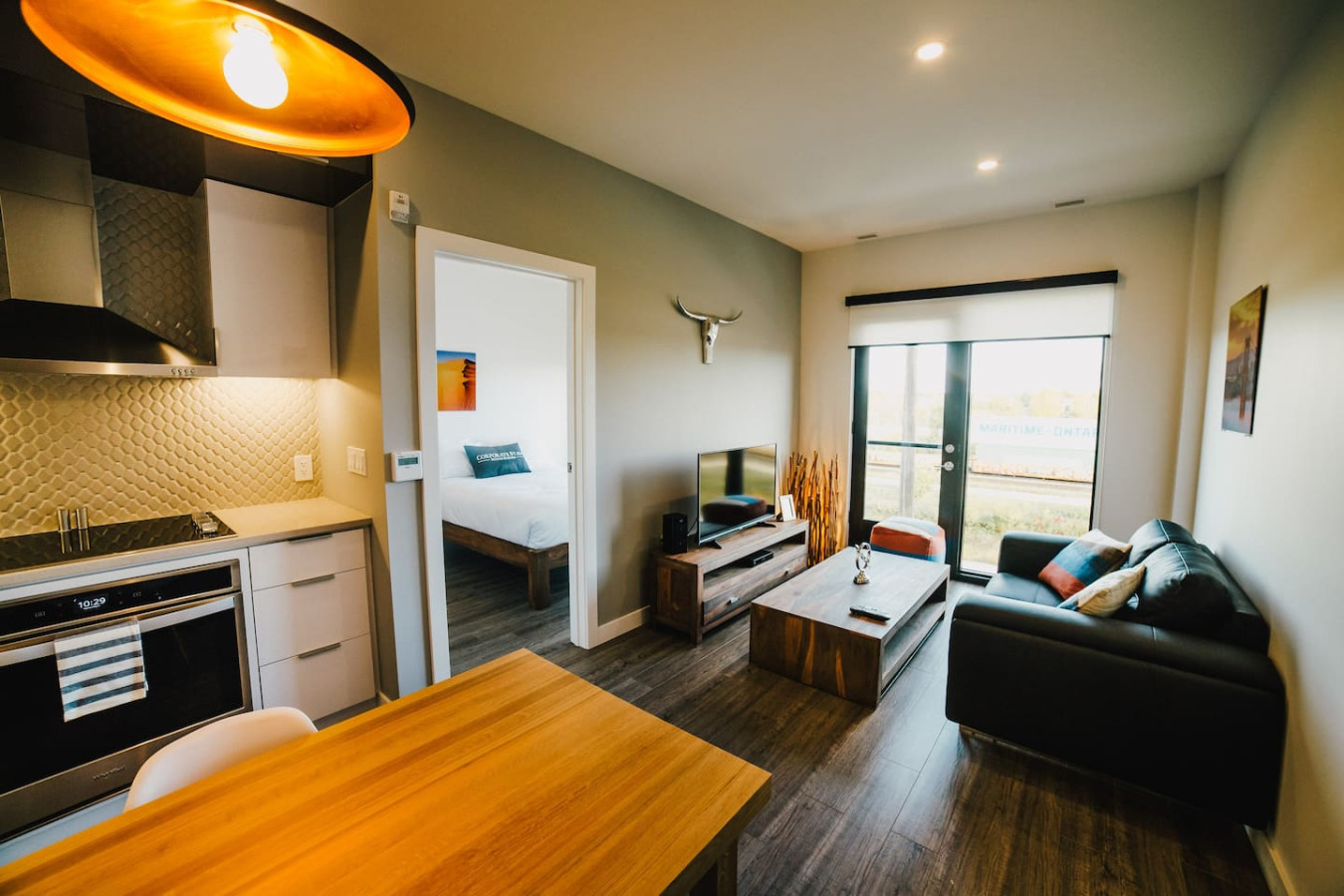 Step into a spacious and welcoming living area with sweeping views of Winnipeg’s Tuxedo neighborhood. Relax on the plush sofa, stream your favorite shows on the Smart TV, or simply enjoy the tranquil ambiance of this thoughtfully designed space.