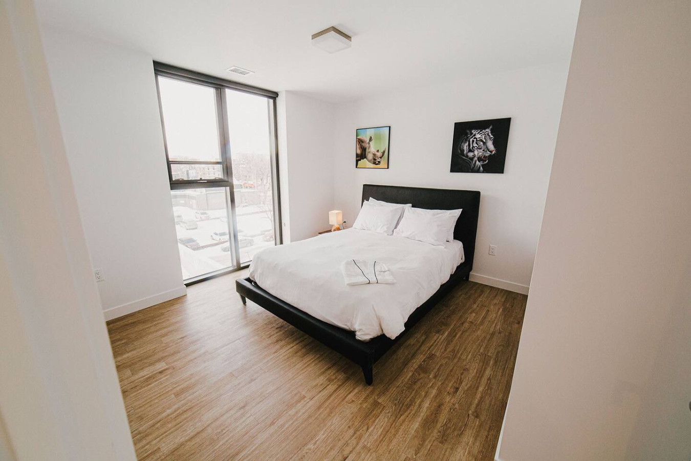 Relax in the tranquil bedroom, offering scenic views of the vibrant neighborhood. The modern bathroom is designed with all the essentials for a rejuvenating experience, ensuring a peaceful start or end to your day.