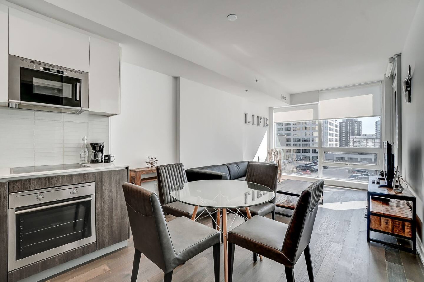 Enter a bright, spacious living room designed as a tranquil escape with sweeping city views. Elegantly furnished with a cozy sofa, a wooden center table, and a Smart TV, this space is ideal for unwinding after a day of exploration. Large windows fill the room with natural light, while the attached private balcony offers a serene space for morning coffee or enjoying sunset views over the city. The adjoining dining area, softly lit and seating four, is perfect for shared meals and conversations.