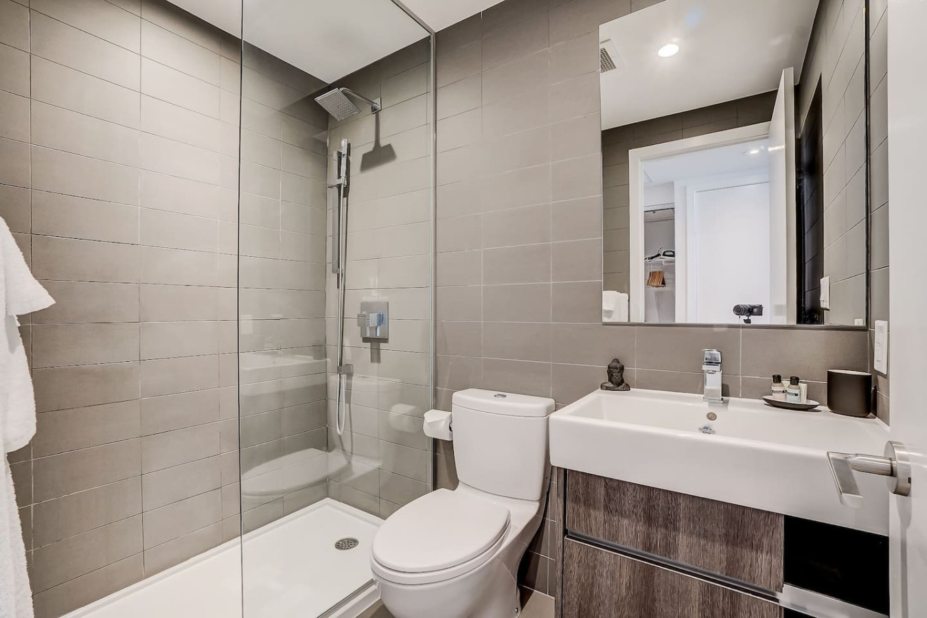 The bathroom includes a chic vanity, a standalone glass-door shower, fresh towels, and complimentary toiletries.