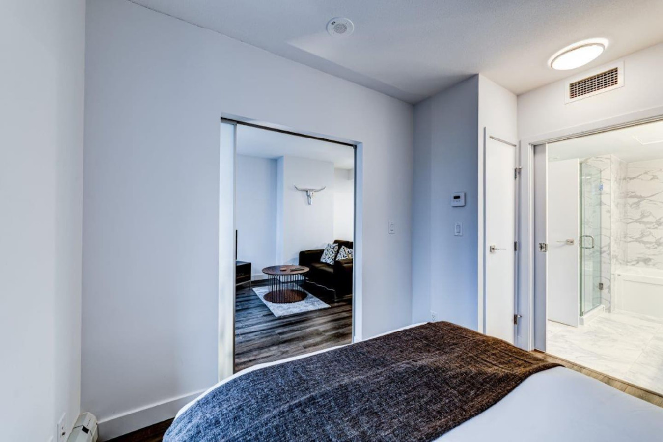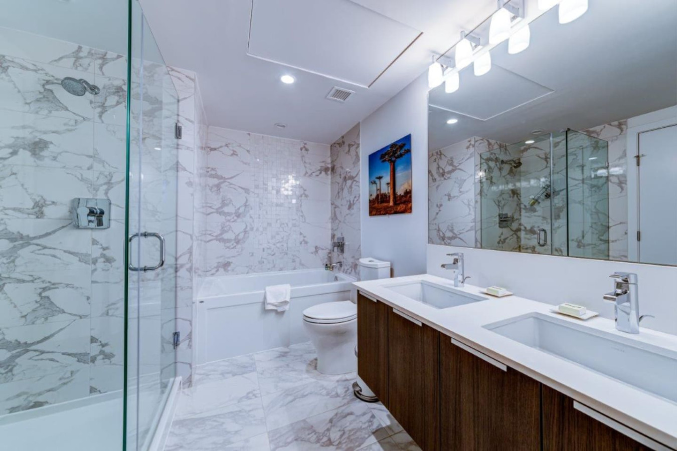 Retreat to the tranquil bedroom featuring a queen-size bed and impressive skyline views. The sleek, contemporary bathroom offers a double vanity with a bath-tub and a separate shower area along with all the essentials for a rejuvenating experience.