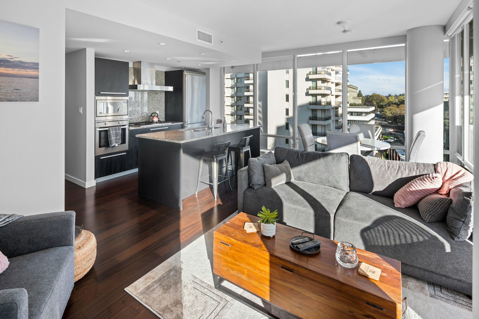 Falls Parliament Suite: The Falls building is Victoria’s premiere luxury condominium complex. You are located in the best location that downtown Victoria has to offer: steps from The Empress Hotel, BC Museum, Parliament Buildings, and the Inner Harbour. This luxury 2 bedroom condo has beautiful south-facing views of Victoria’s best attractions. Luxury is the theme, from its spa-inspired bathrooms, marble countertops, gas range chef’s kitchen, and, of course, air conditioning throughout. Enjoy luxury amenities, including a common outdoor pool and hot tub, as well as a gym and lounge area. This is the IT spot to spend your short or long-term stay in Victoria.