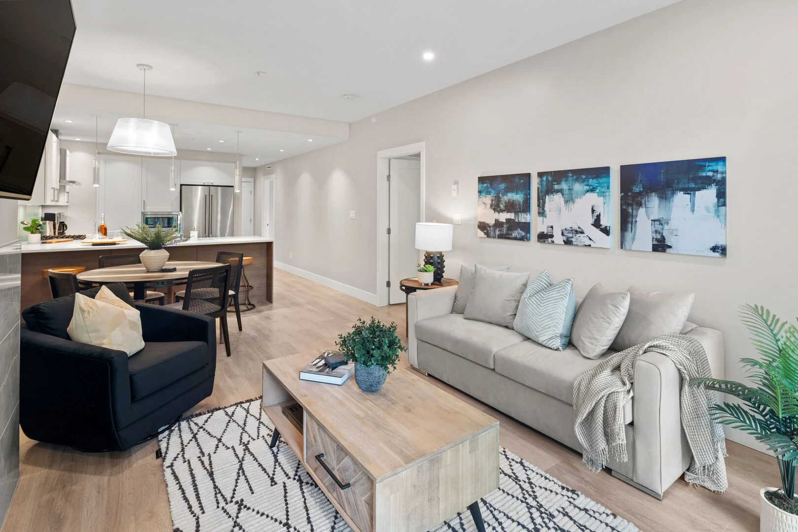 As you enter the apartment, you’ll immediately notice the attention to detail and the brand-new furnishings that create a modern and inviting atmosphere. The open-concept living area boasts ample natural light, creating a warm and welcoming atmosphere to relax and unwind after a day of exploration. You’ll find a fully equipped kitchen ready for culinary creations, the chef-style kitchen boasting granite countertops and high-end stainless steel appliances, with an industrial-chic dining area.