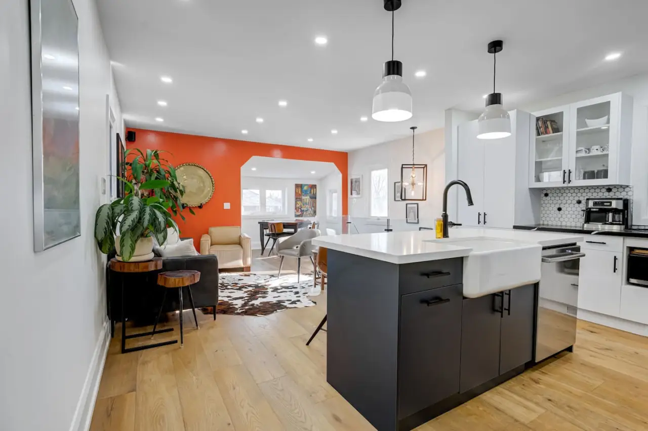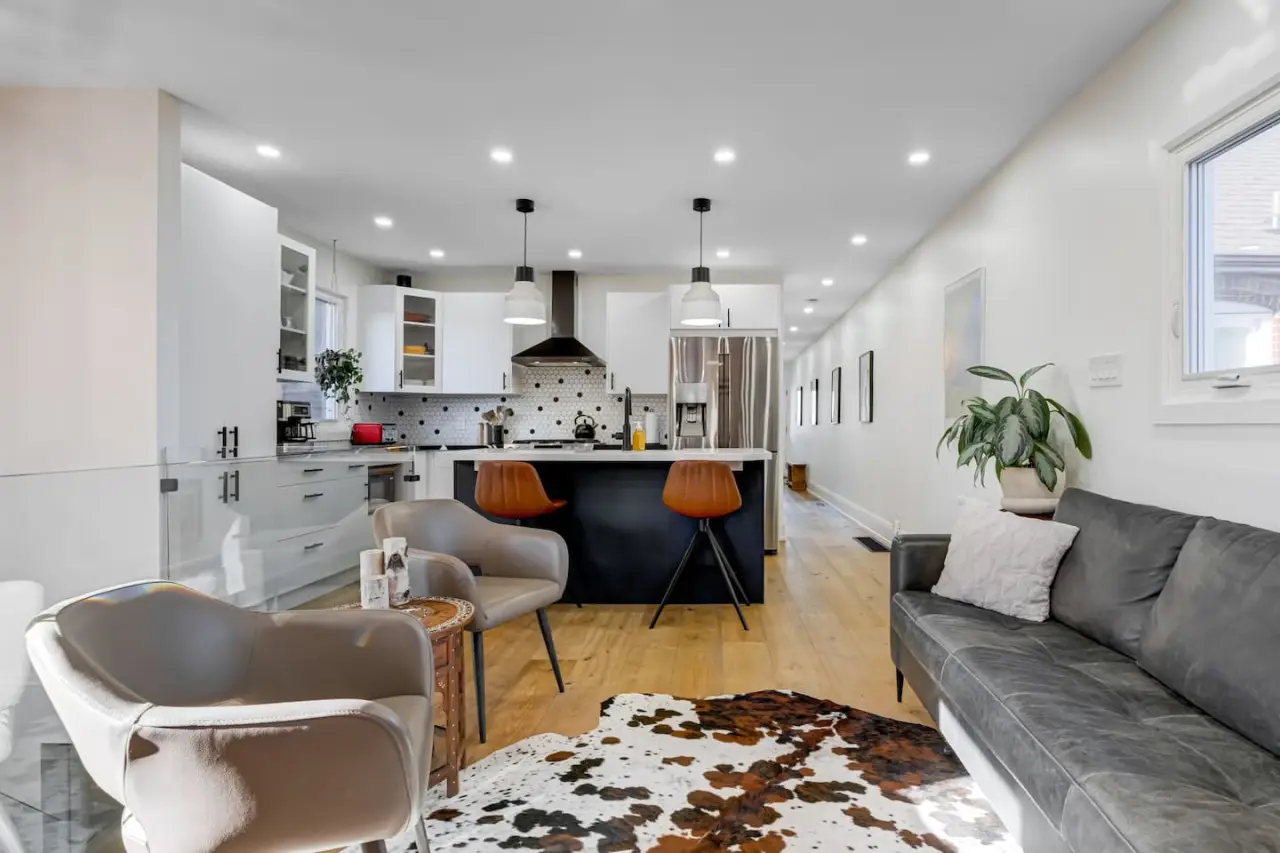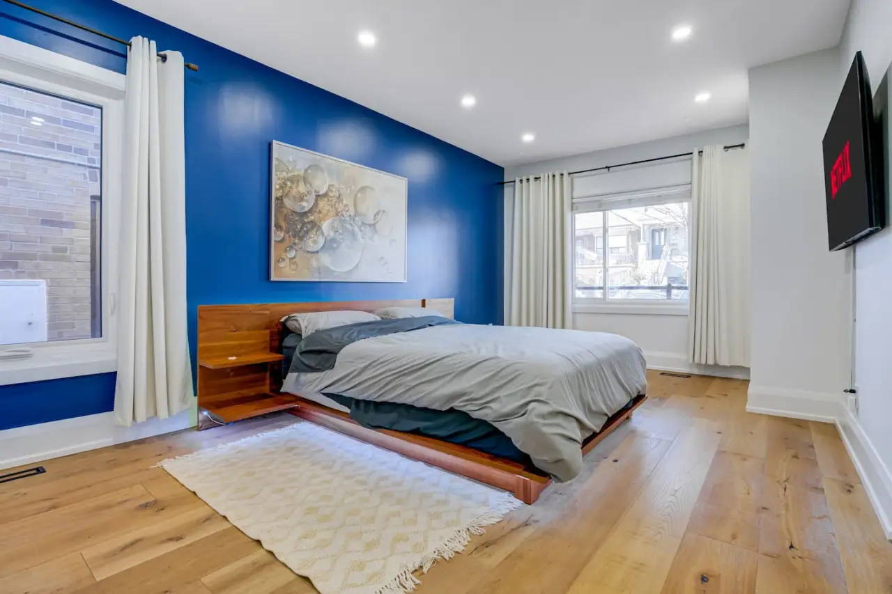 This 1 bedroom condo with a den is located in downtown’s vibrant heart, and only steps away from the CN Tower, Rogers Centre, and Scotia Bank Arena. It has a stylish interior with a cozy queen bed and sofa bed, a full kitchen, and high-speed Wi-Fi. The lving room is furnished with a comfortable sofa that doubles as a bed, a flat-screen TV, and tasteful decor. The kitchen is fully equipped with modern appliances, including a refrigerator, stove, microwave, and coffee maker, and has all the essentials for cooking and dining in. The bedroom has a queen-sized bed with high-quality linens, and ample closet space. This unit includes an in-unit laundry, and is close to bus stations.