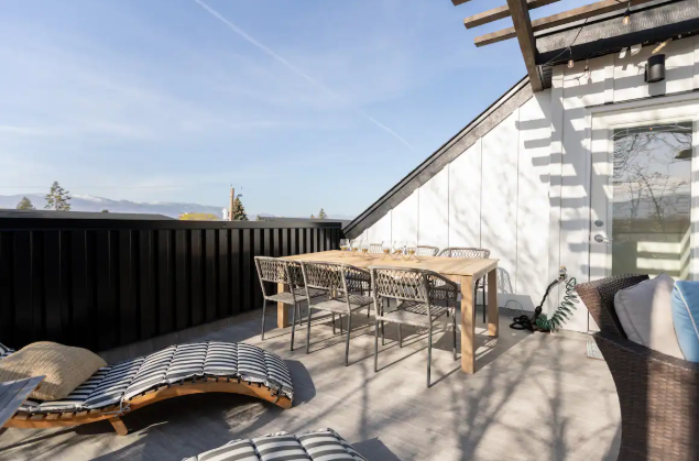 One of the highlights of our townhouse is the rooftop patio with string lighting, where you can enjoy a glass of wine in the evening or soak up the sun during the day. The cozy and cute decor creates a warm and inviting atmosphere, making you feel at home.