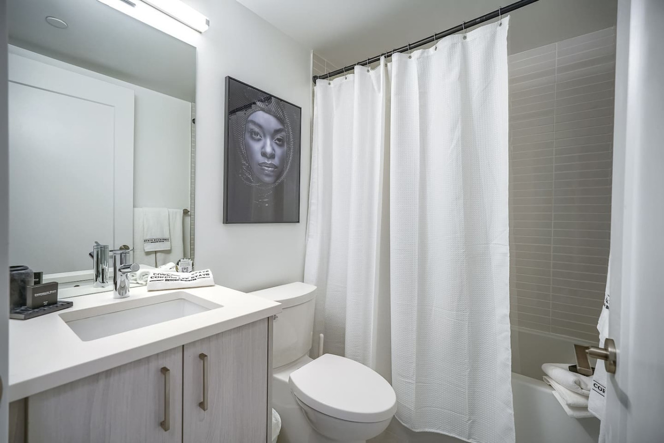 Pamper yourself in the attached contemporary bathroom, your personal spa-like retreat, showcasing a sleek vanity and a relaxing bathtub (availability may vary). Fresh, luxurious towels and essential toiletries guarantee a seamless and indulgent experience, allowing you to unwind in style.