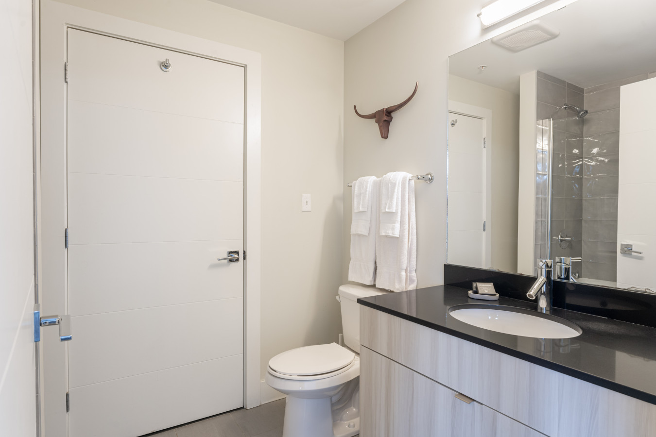 Unwind in the serene first bedroom, featuring breathtaking skyline views. The attached bathroom is designed with modern amenities, including a sleek vanity, plush towels, and essential toiletries, ensuring you feel refreshed and pampered.