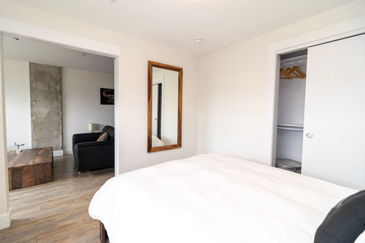 Unwind in the serene bedroom with a queen-size bed and stunning skyline views. The modern bathroom offers a sleek vanity, fresh towels, and essential toiletries for a rejuvenating experience.